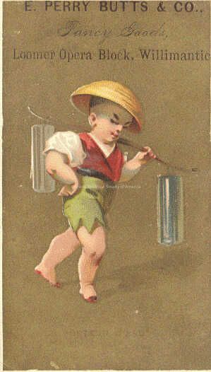 Front: In front of a brown background, is a boy wearing a white puffy shirt over his red vest and green pants. The boy has one of his hands bended and resting on his hips while his other hand is balancing a bamboo stick that is resting on his shoulders and balanced by a a white cylinder shape object on one side a a blue cylinder object on the other. Written on the tradecard is the following: E. Perry Butts & Co., Fancy Goods, Looper Opera Block, Willimantic.