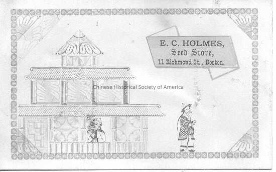 Front: Enclosed around a flower gold border is an illustration of a three tier building with Asian inspire arching tile roof. On the first floor of the building a man is sitting and resting his hands on the windown sill while anothe rman is walking away from the building wearing a traditional robe and pants, a sampan hat, and a long queue. Written on the upper right hand corner is the following: