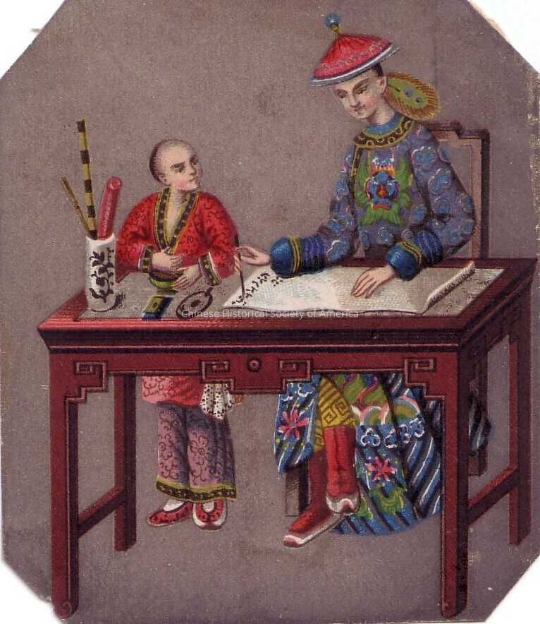 Front: A Chinese man on the left sitting at a desk, dressed in a traditional Chinese robe, teaches his pupil Chinese caligraphy. His student, dressed also in a traditional Chinese style outfit, observes his teacher's writing technique while he stands next to him.