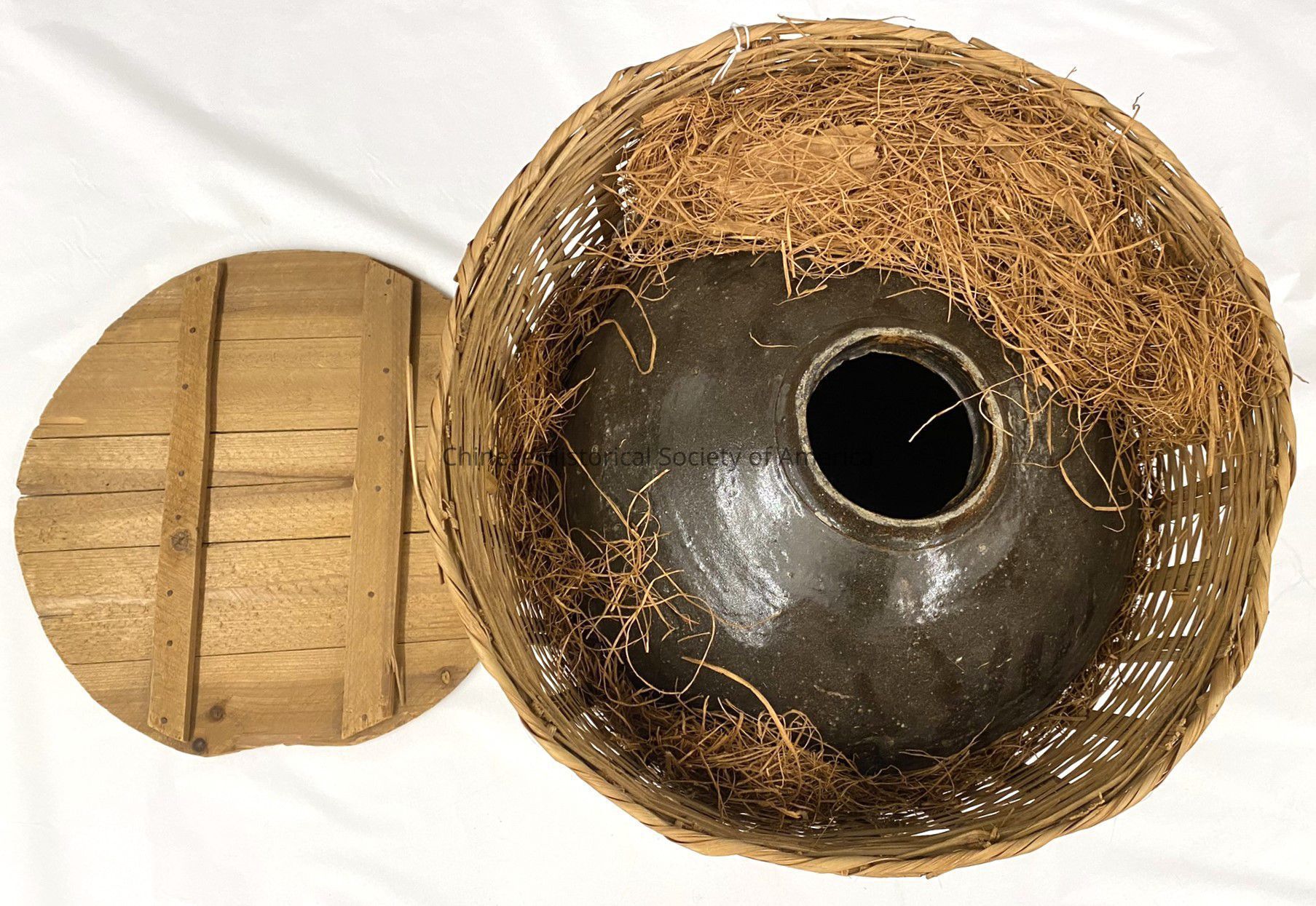 Basket with lid, stamped with, "CCT/SF/Made in China/614". On the side of the basket there is another stamp which reads, "Earthenware with Care" along with Chinese writing underneath. Inside is a large brown-glazed ceramic jar for preserving ginger.