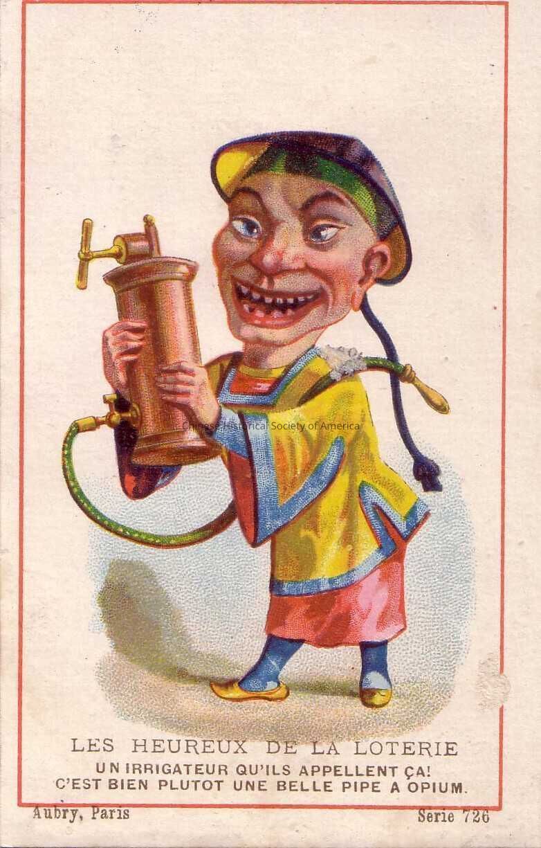 Front: An orientalized Chinese man wearing a yellow blue and red Chinese traditional robe is grinning while he holds gas tank with an attach hose swung over his shoulder. The following caption can be found directly below this illustration: