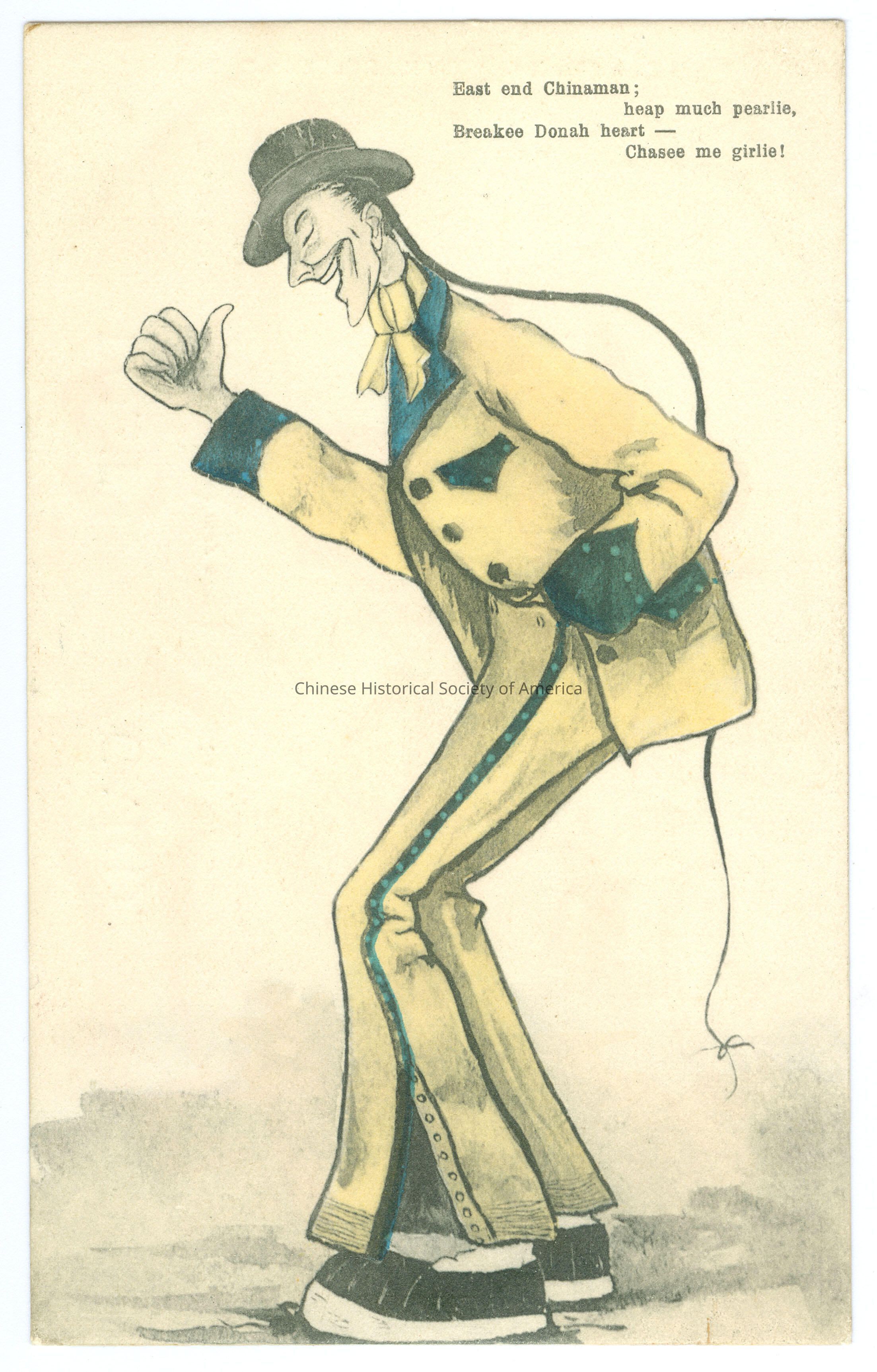 Color. Illus. Caricatures; Chinese Men: A tall Chinese man wearing a bowler hat with a long queue down his back is wearing a yellow suit, he has one hand in his pocket with the other outstretched with his thumb up, he is smiling with slanted eyes.