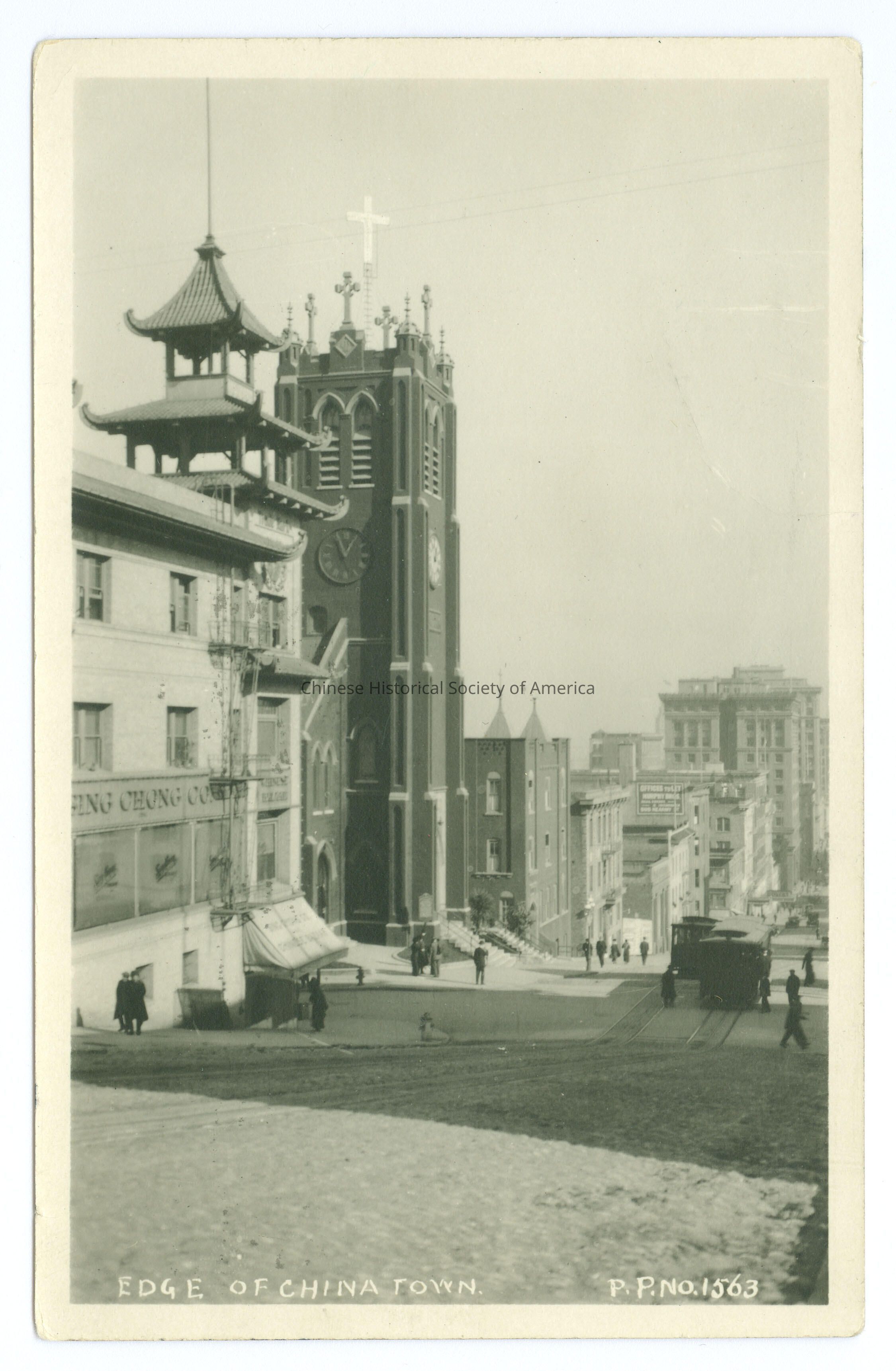 Front: Caption: "Edge of China Town, P.P.No. 1563." Back: Addressee: "M.B. Johnson P.O. Box 1313, Salt Lake City, Utah. Message: " San Francisco 9/29/1926 Got quite a thrill out of riding on the cable cars and meeting some of my yellow friends. Like this place very much and haven't anyone work yet." Postmark: "San 'Francisco, Calif. Sep 1926 3:30 PM", stamped in black. Stamp: A red 2 cent stamp with a side picture of George Washington, "United States Postage, Washington 2 Cents." Old Accession #: A)-