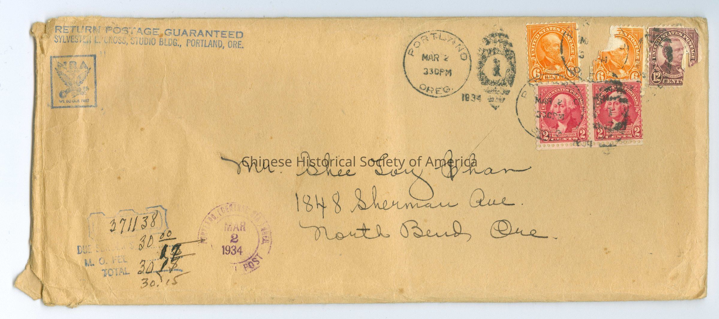 Envelope addressed to Mr. Shee Loy Chan from the Sylvester L. Cross Studio Building.