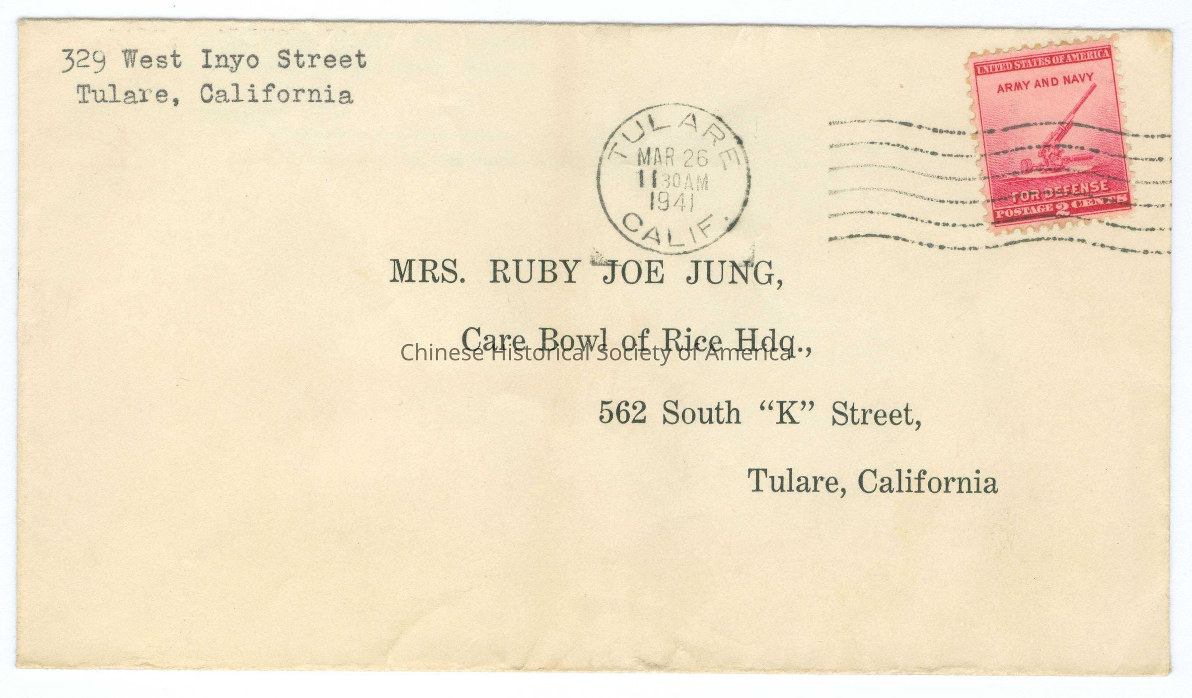 Envelope addressed to "Mrs. Ruby Joe Jung, Care Bowl of Rice Hdg."