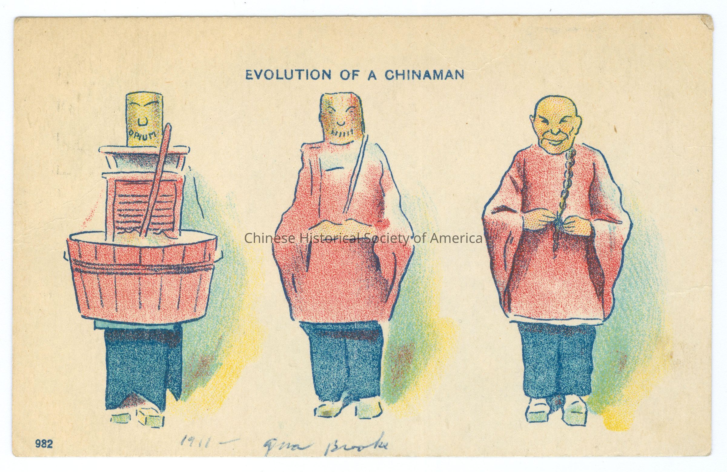 Front: Caption: "Evolution of a Chinaman." Message: "1911-que broke", handwritten in blue. "982." Back: Postmark: "Wash. Dec 20 1911 8 AM", stamped in black. Stamp: A green one cent stamp with a side picture of Benjamin Franklin, "U.S. Postage, One Cent". Message: "Dec 19th 1911, Dear [ILLEGIBLE]." Old Accession #: LTX