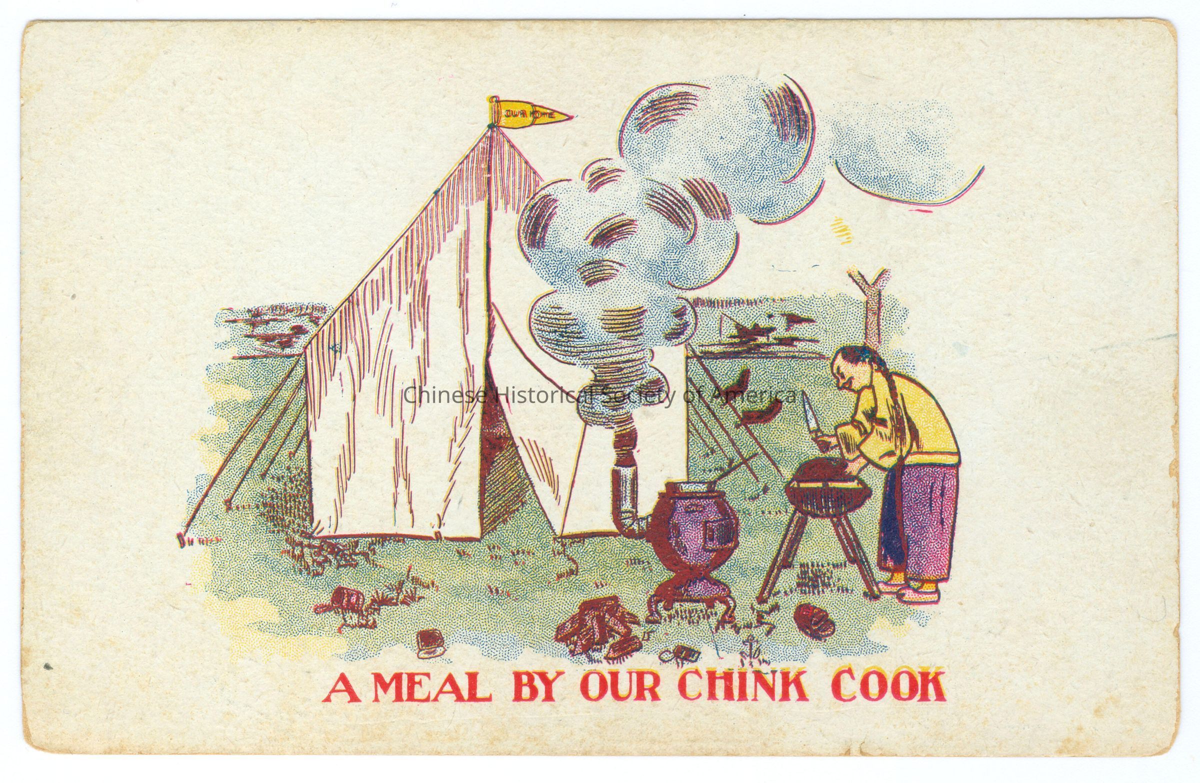 Color. Illus. Caricatures; Chinese Cook: Outside scene where there is a pitched tent, a Chinese man with a queue is holding a knife bent over a table about to cut, there is a stove that is letting out smoke.