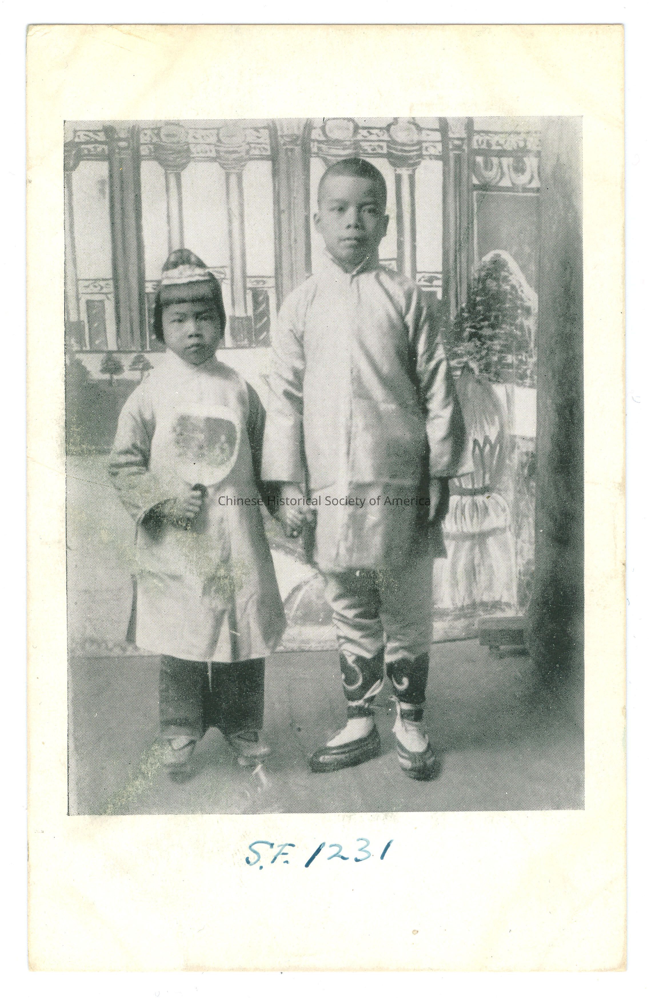 B&W. Photo. SF; Singing Children: 2 Chinese children a boy and girl, the boy has a long white shirt with a buzz cut and is holding the hand of the little girl who is holding a square fan in her other hand.
