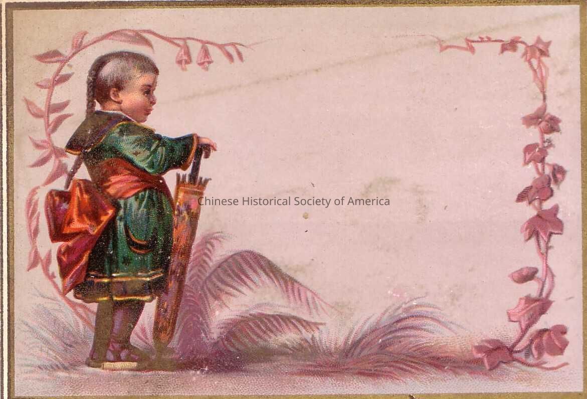 Front: A Chinese boy dressed with a queue, is clutching an umbrella. He is wearing traditional Chinese silk clothes which include a green aned black robe, fastened in the back with a bright red bow. The Chinese boy is standing on the left side of the tradecard, bordered around vines from plants.