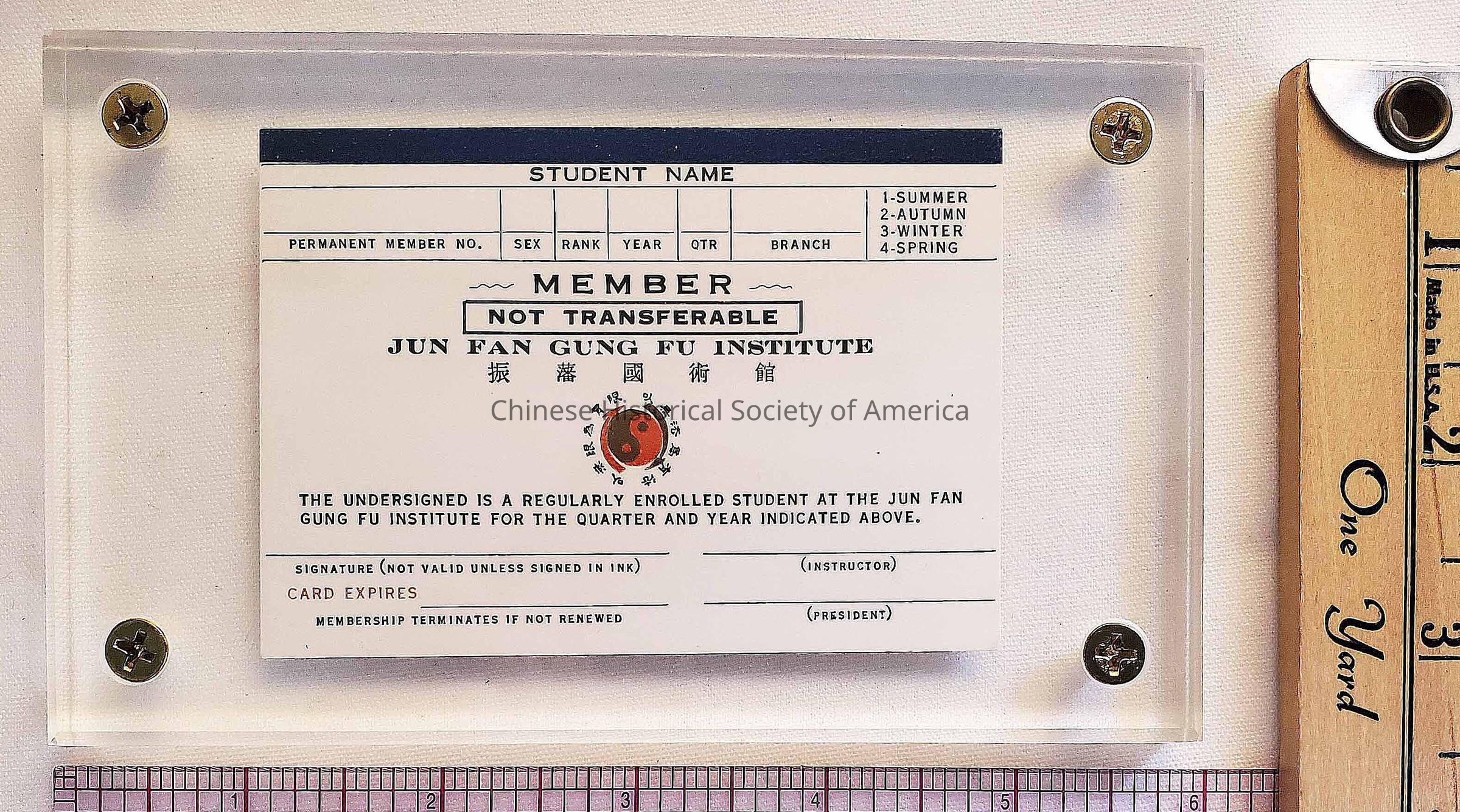 Student Membership card, non transferable; Recto: Blue trim at top, gold and red yin yang; verso: blank, original, encased in plexi.Dimensions