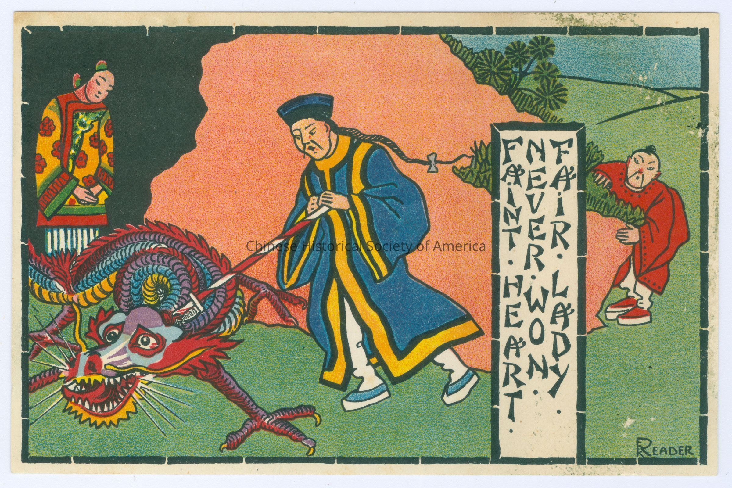 See CHSA-05016-05017. Front: Caption: "Fair Lady Never Won Faint Heart." "Reader." Back: "The Ellanbee "Chinese,, Series, No. 131 - Designed in England - Chromographed in Belgium." "Ellanbee"; "Landeker & Brown London." Old Accession #: E)-