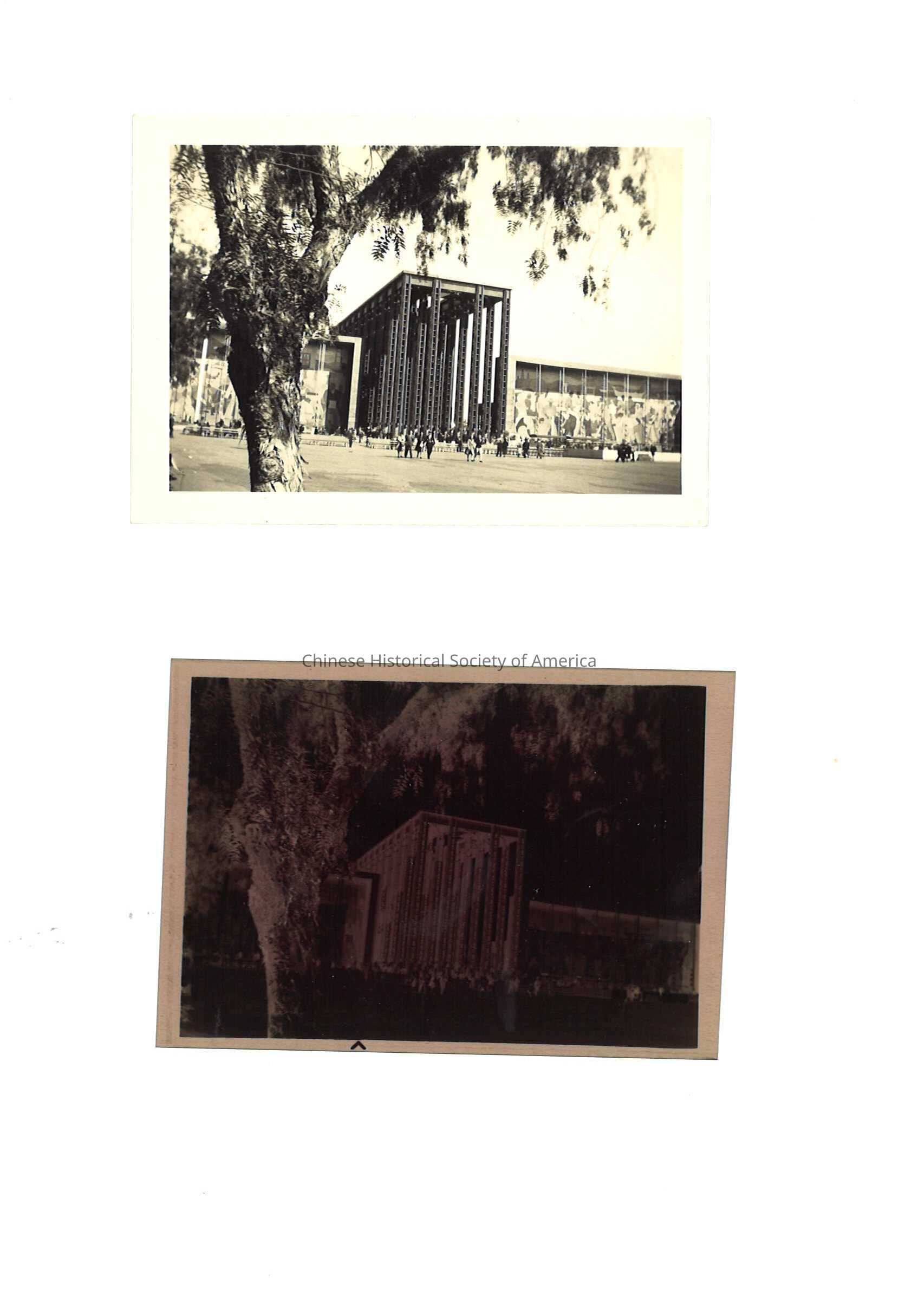A: The Federal Building from the World Fair seen behind a large tree. Murals surround the steel structure. B: photo negative. B: photo negative