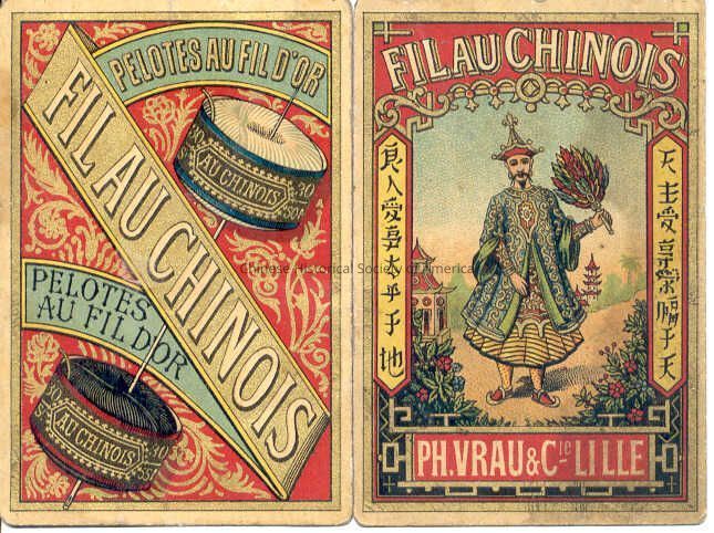 FRONT: In a two sided folded tradecard the outer sides have two different illustrations. The advertisement on the left is for "Fil Au Chinois, Pelotes au fil d'or, Pelotes au fil d'or," and illustrated are two spools of thread at each end of a needle in front of a red and gold background. The advertisement on the right is for "Fil Au Chinois"w/ Chinese characters written on both the left and right side of the illustrations in front of a yellow banner and at the bottom is another banner that states, Ph Vrau & Cie Lille. A Chinese man wearing a traditional Chinese outfit and holding a feather fan is illustrated walking down a dirt path.