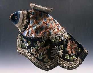 Black silk stain fish shaped wind cap embroidered with floral sprays and swastika scepter in satin and Peking stitches and edged with rows of woven trim.Context