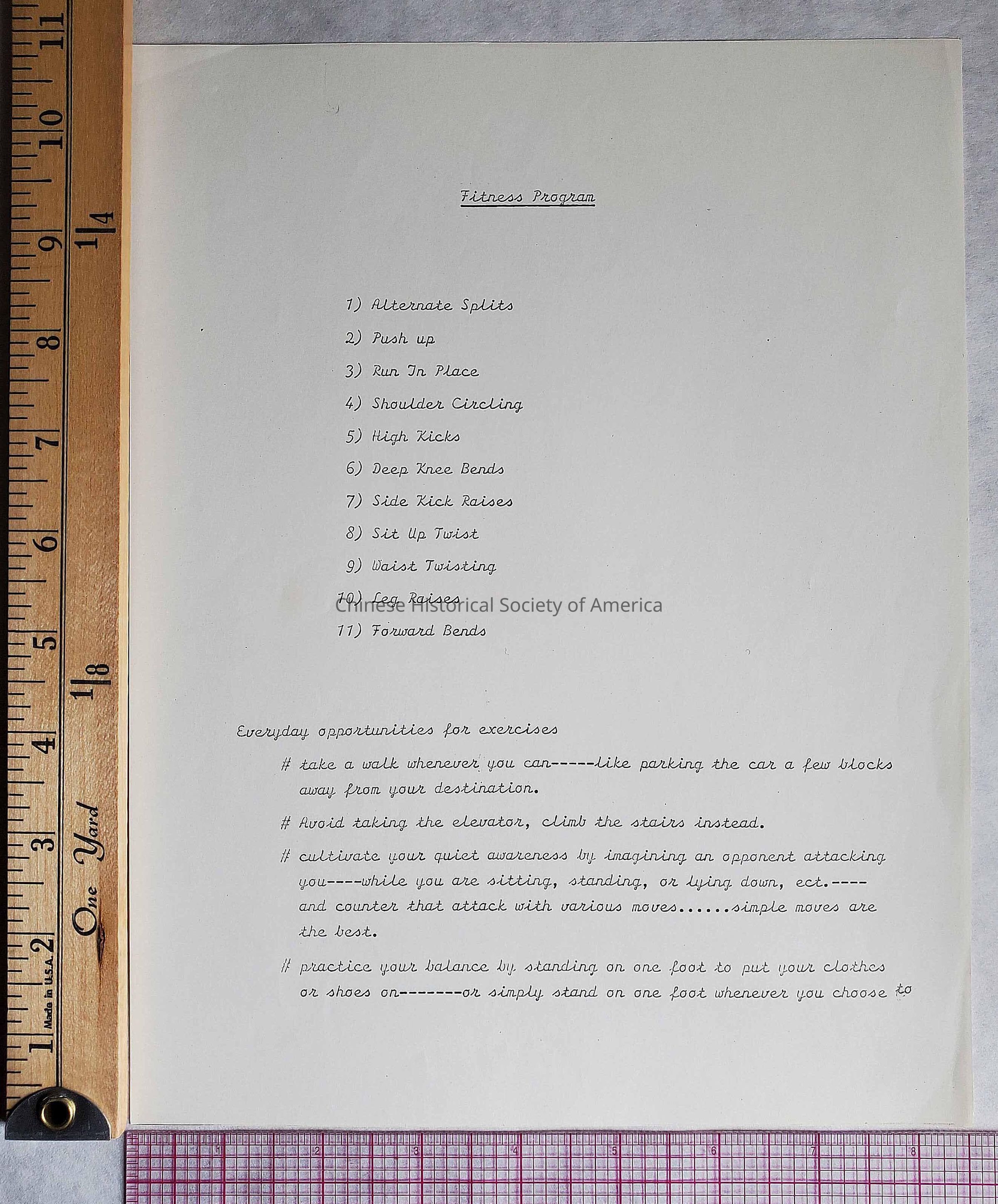 One page, of Fitness Program, possibly page two of the Fitness Program for L2021.4.017. Typed on same type of paper and typed with the same typeface. n.d.Context