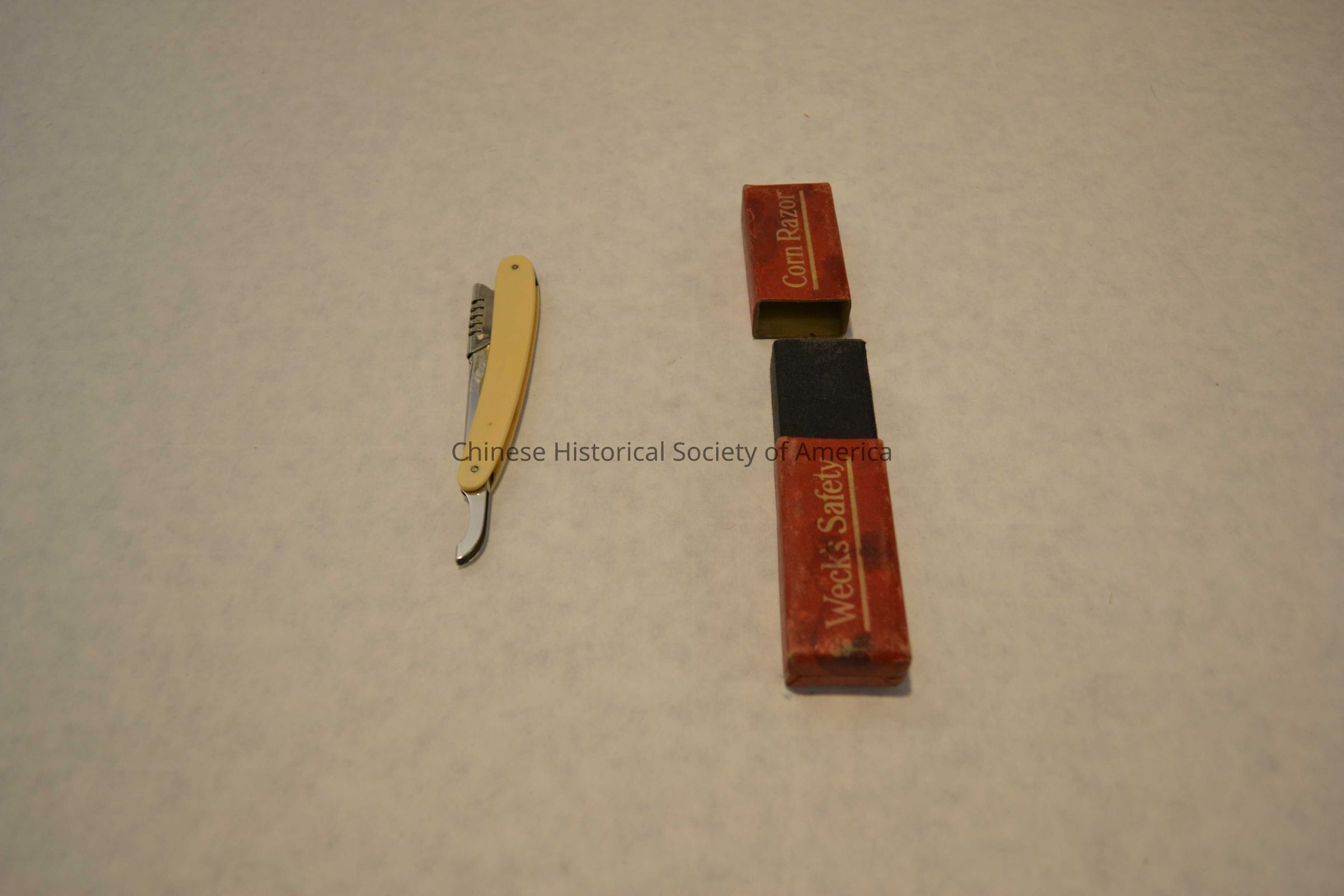 folding safety razor, possible bone handle, red box "Weck's Safety Corn Razor"