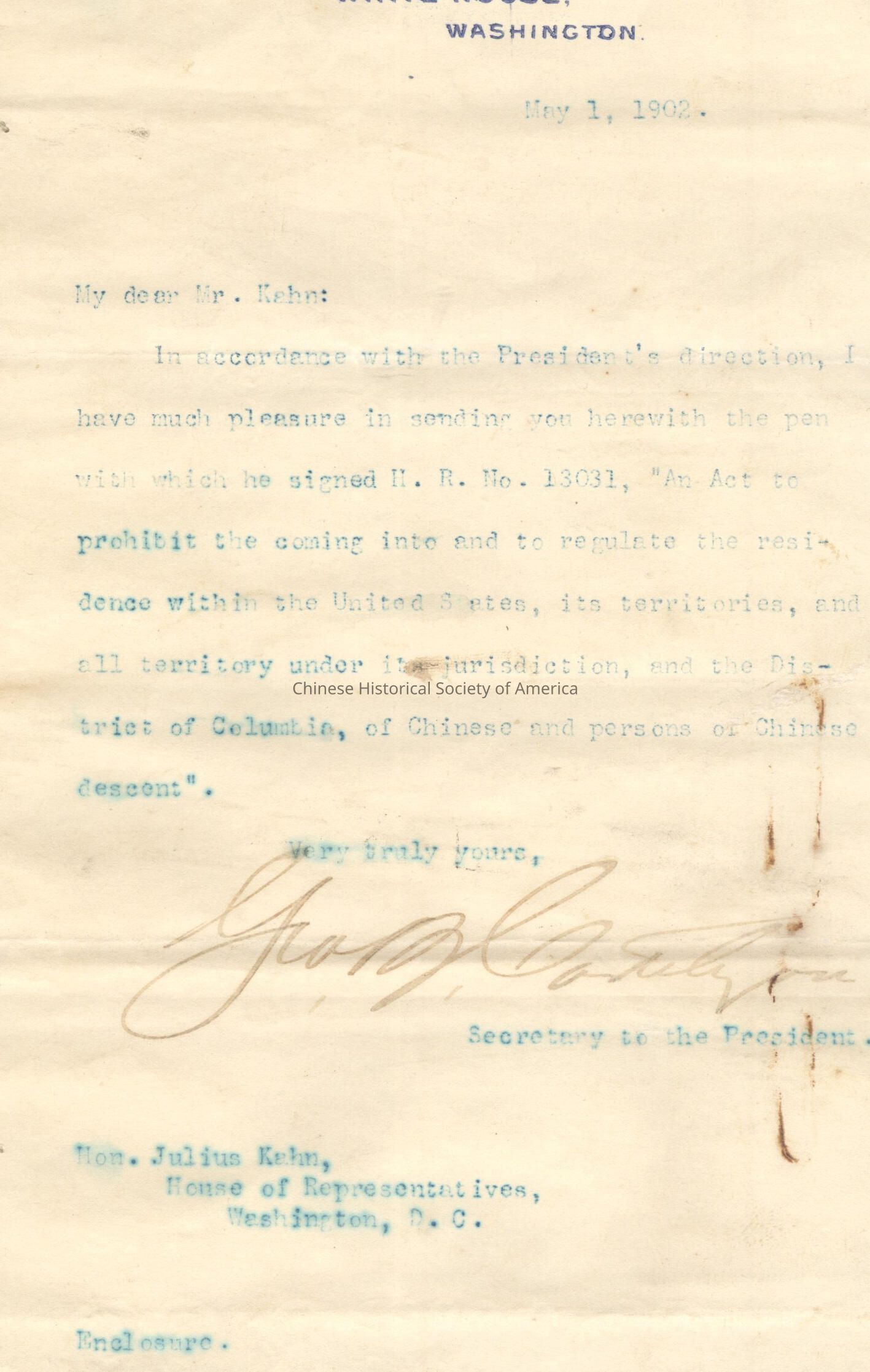 Transcription of letter: My Dear Mr. Kahn: In accordance with the President's direction, I have much pleasure in sending you herewith the pen with which he signed H.R. No. 13031. "An Act to prohibit the coming into and to regulate the residence within the United States, its territories, and all territory under its jurisdiction, and the District of Columbia, of Chinese and persons of Chinese descent. VTY, Secretary to the President; dated May 1, 1902.
