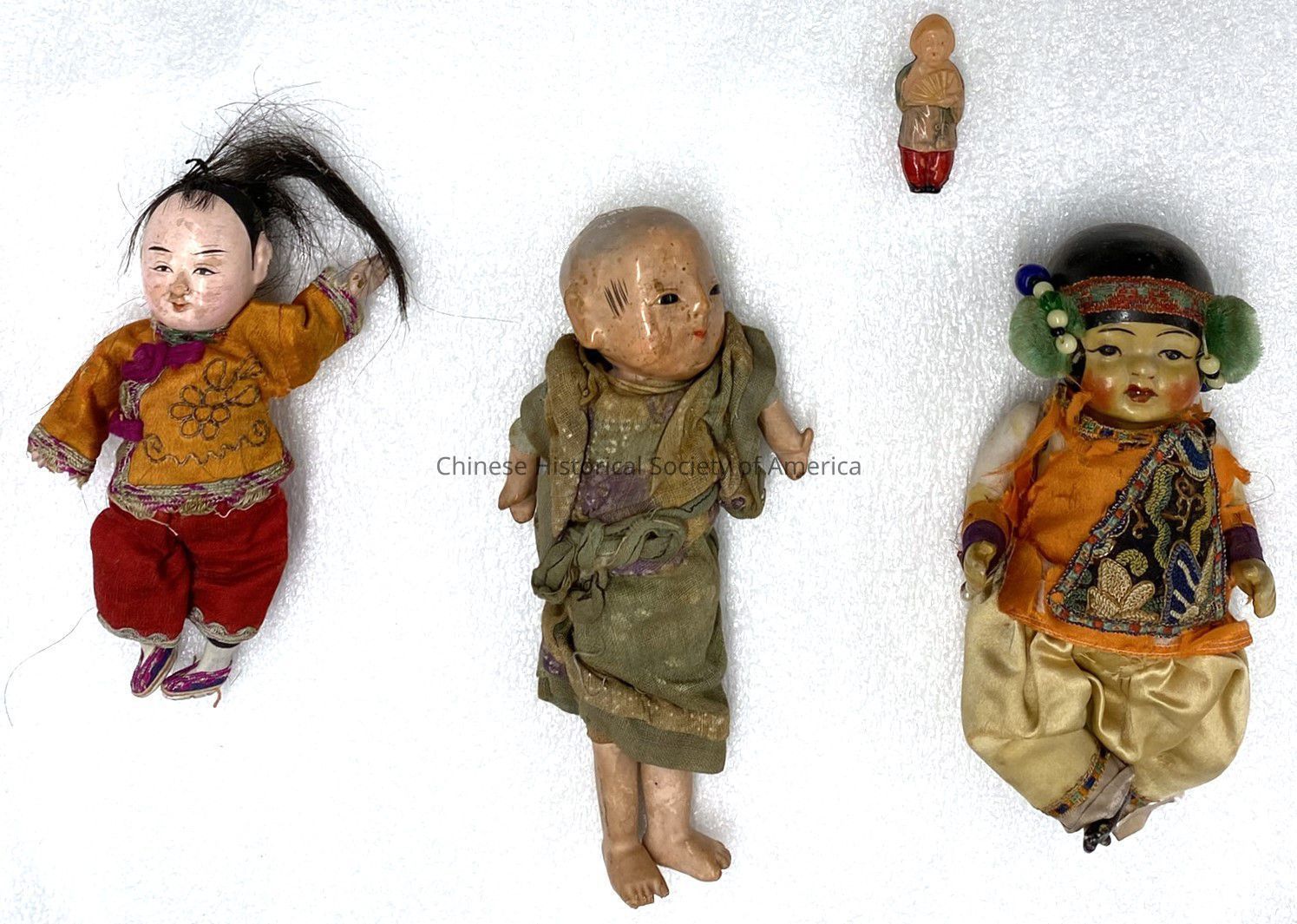 Four dolls wearing Chinese clothing with painted on faces. The first doll is made with porcelain and has articulated limbs. It is wearing a red, green, black, and white beaded headband/hat; an orange top with embroidered fabric; yellow-tan colored satin pants, and has little black shoes and rosy cheeks. Its orange top is falling apart in places.