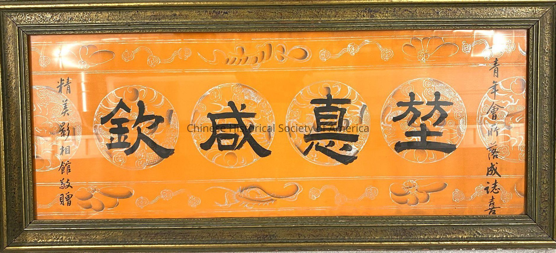 Chinese calligraphy on an orange background with gold decorations throughout. Framed in wood with gold paint.