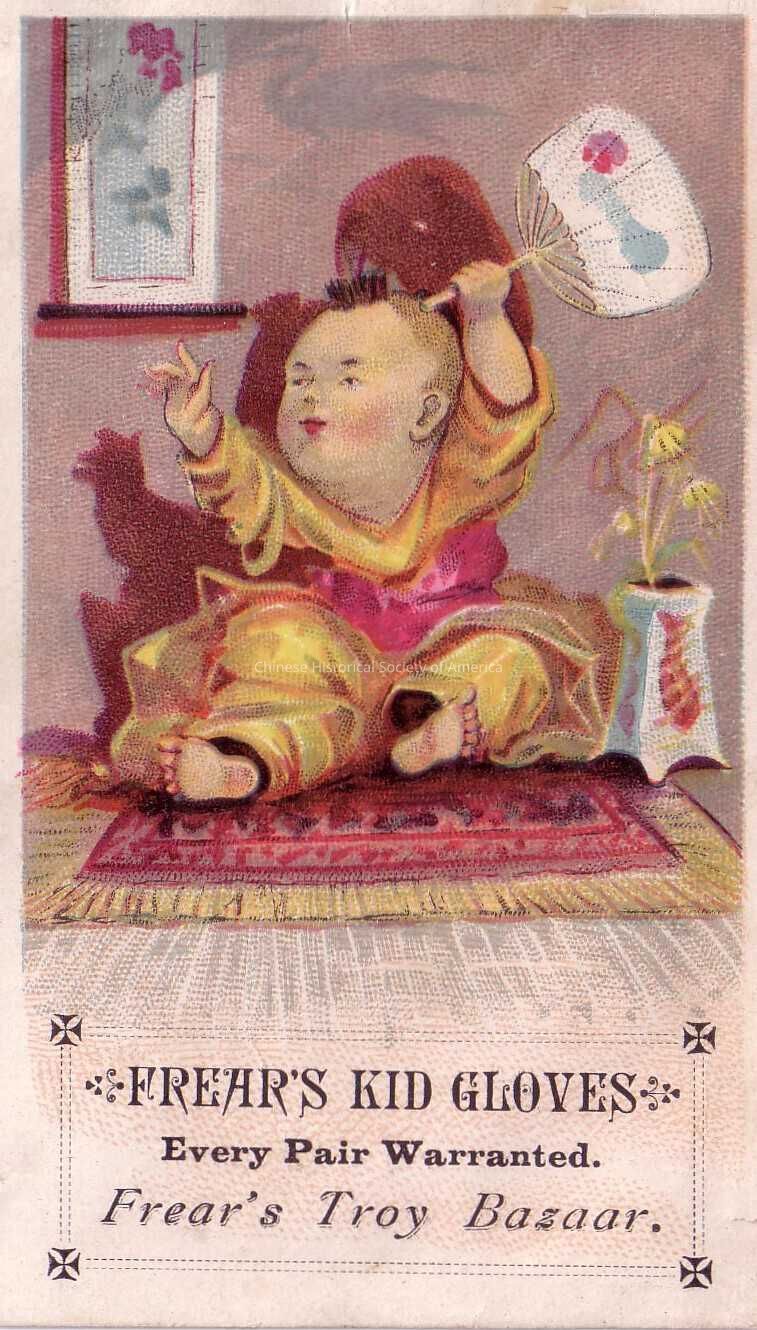 Front: A baby, who is sitting on a pink embroidered rug, is wearing a yellow robe with a pink slash around it and has a small patch of hair growing on the top of his head. With his left hand he is playing with a white fan with a blue and red design on it and behind him is his shadow, a painting and a procelain vase with a goldfish design on the sides and a bamboo plant growing inside of it. The advertisement for this tradecard is for the following: