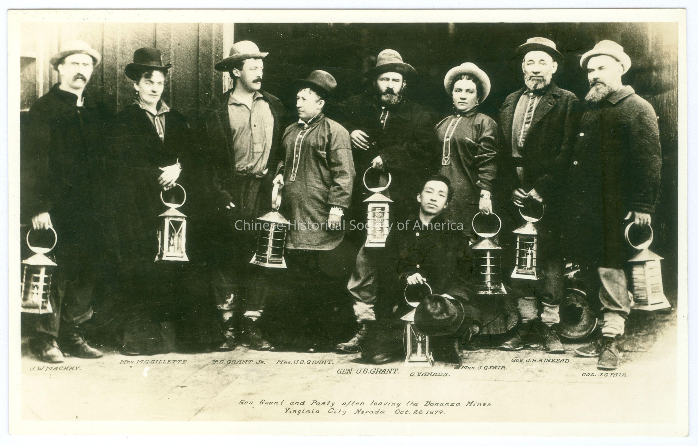 See CHSA-07812. Front: Caption: "Gen. Grant and Party after leaving the Bonanza Mines Virginia City, Nevada Oct. 28 1879"; "J.W. Mackay, Mrs. M.G. Gillette, U.S. Grant Jr., Mrs. U. S. Grant, Gen. U. S. Grant, S. Yanada, Gov. J.H. Kinkead, Col. J.G. Fai". Back: "5/14/87 AIRX" in pencil.