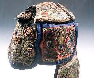 Black and blue silk cap appliqued with finely embroidered floral and figural design panels done in satin and Peking stitches with paper and couched accents.Context