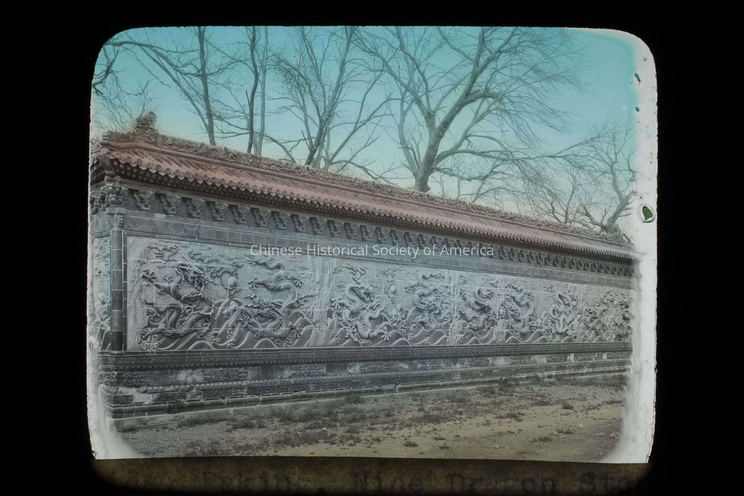 Text in the front: "China", handwritten in white; "China. Peking. Nine Dragon Stone Screen, Winter Palace.", typed in black on a paper glued to the slide.