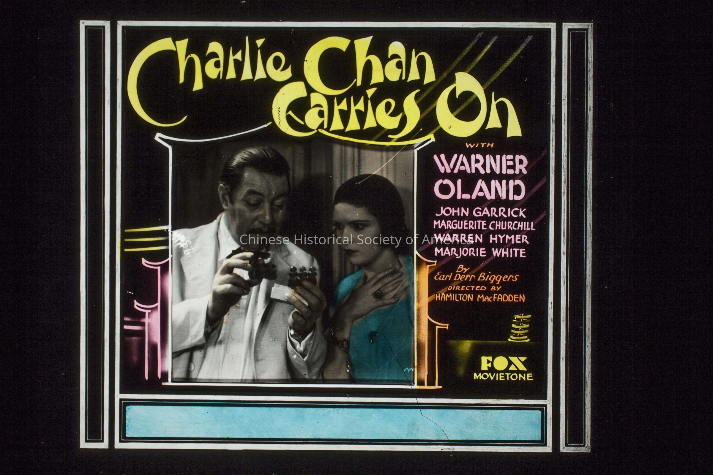 Text in the slide: "Charlie Chan Carries On, with Warner Oland, John Garrick, Marguerite Churchill, Warren Hymer, Majorie White, By Earl Derr Biggers Directed By Hamilton MacFadden, Fix Movietone." Text in the front: "Charlie Chan Carries On", stamped