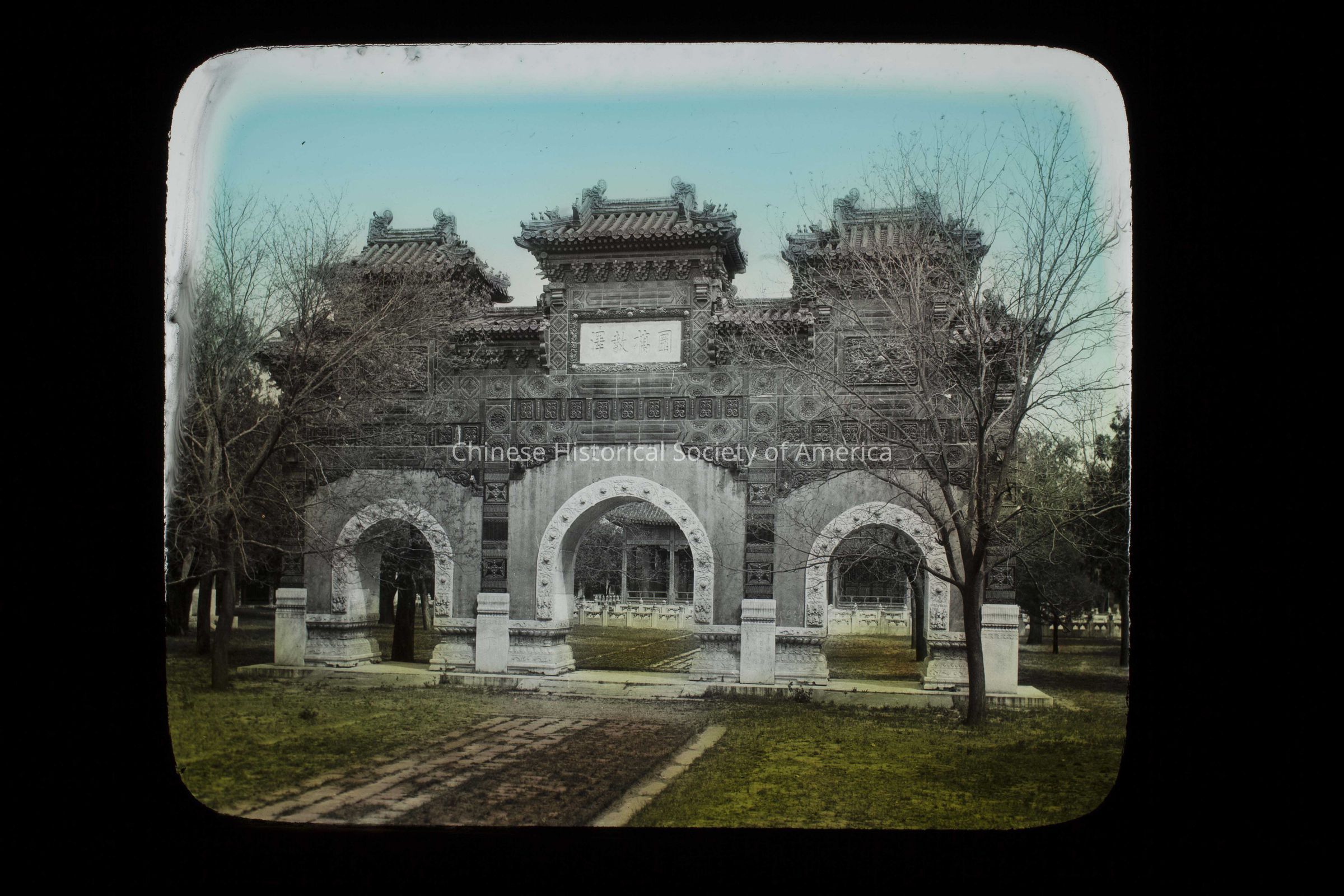 Text in the front: "Peking-China", handwritten in white; "Canadian Pacific Railway"; "China. Peking. Memorial Arch of Yellow and Green Tile, Hall of Classic.", typed in black on a paper glued to the slide. There is a crack on the back glass panel on the