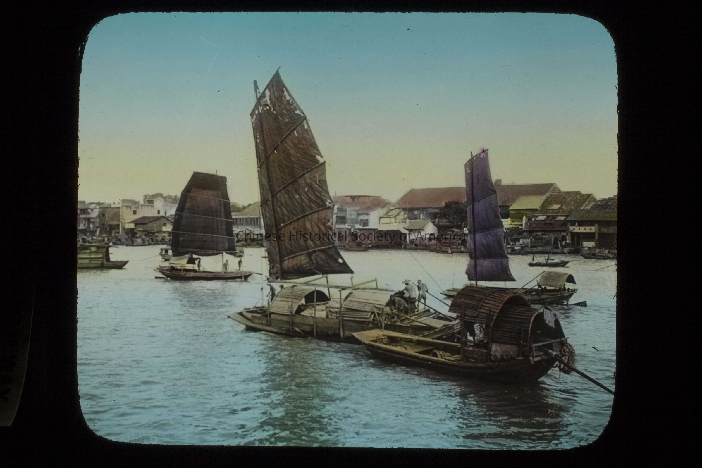 Text in the front: "China", handwritten in white; "Canadian Pacific Railway"; "Junks on Whangpoo river. Shanghai", typed in black on a paper glued to the slide.