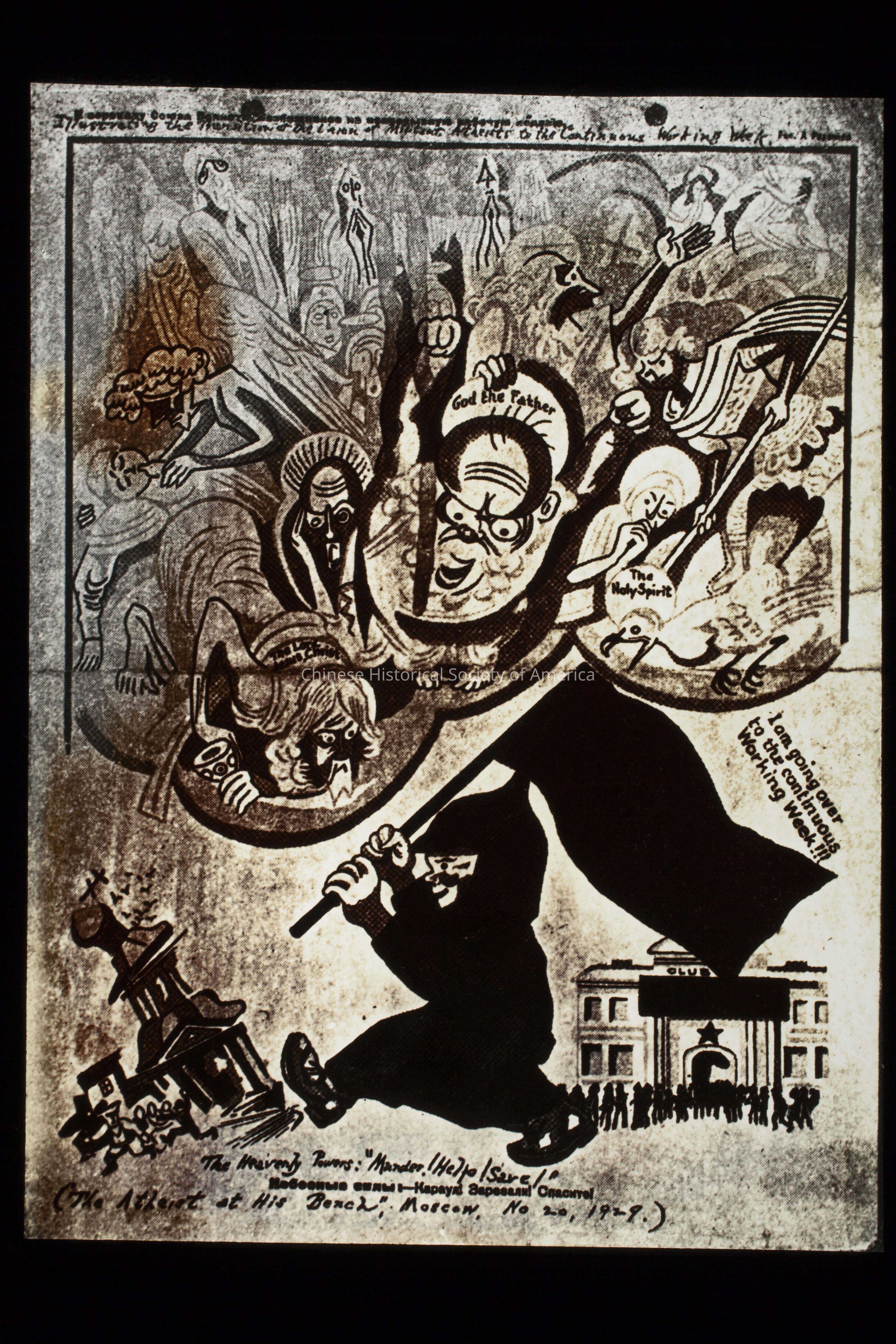 Text in the front: "Soviet Soldier Destroying China-Gods Enraged", handwritten in black; "Produced by Bond Slide Co., Studio Chicago"; "R.62 A", handwritten in red on a label stuck to the slide.