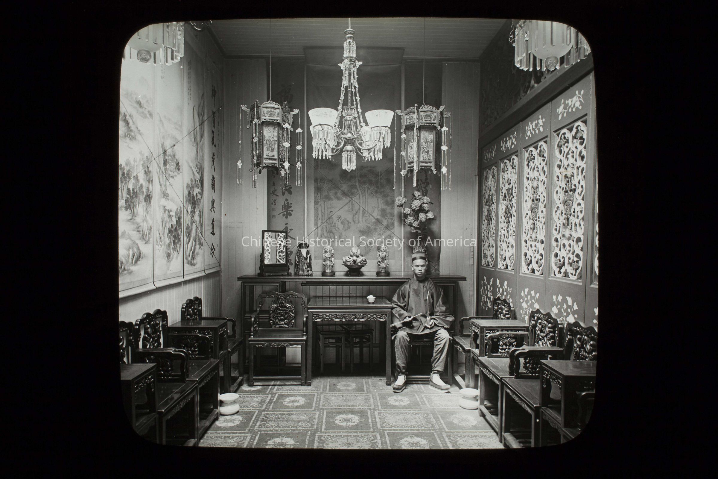 Text in the front: "San Francisco Smoking Room Chinese Restaurant", handwritten in white; "Negative by----Slide by----Fred I. Monsen"; "Smoking room Chinese Restaurant", handwritten in black on the paper within in the slide; "1.", handwritten in black onMade/Created
