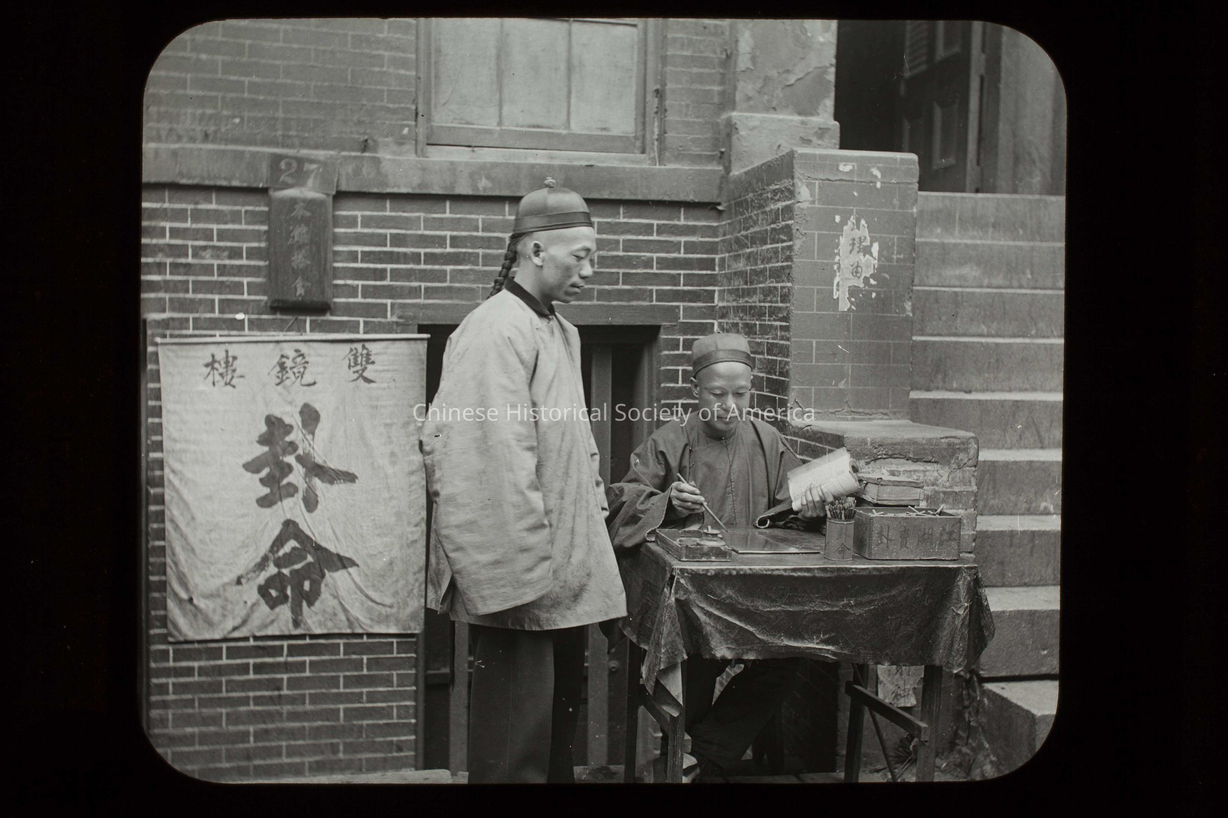 Text in the front: "Negative by----Slide by----Fred I. Monsen"; "Chinese Fortune Teller", handwritten in black on the paper withn the slide; "6", handwritten in black on a white label stuck to the slide. Text in the back: "Letter Writer and Grocery onMade/Created