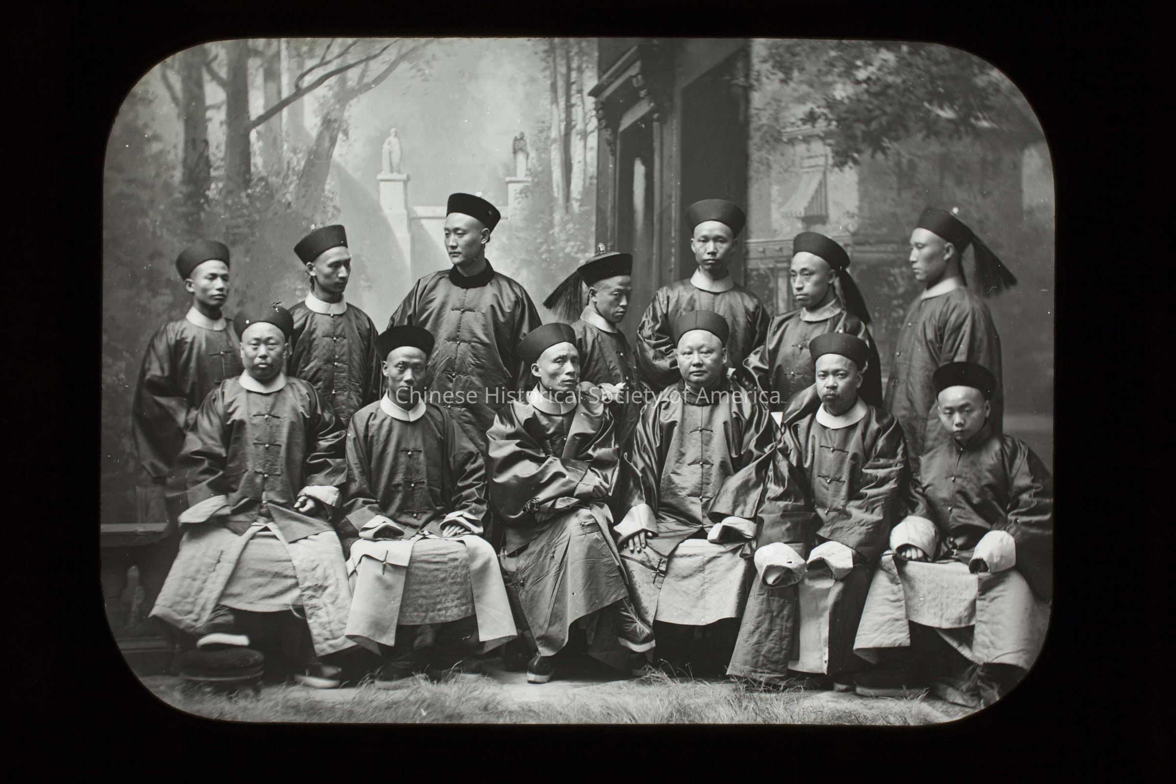 Text in the front: "San Francisco (See A), Chinese Group", handwritten in white; "Frederick I. Monsen"; "Suite and bodyguard of Chong Yen Hoon. Chinese Minister.", handwritten in black on the paper within the slide and printed on the back of the photo; "7", handwritten in black on a white lMade/Created