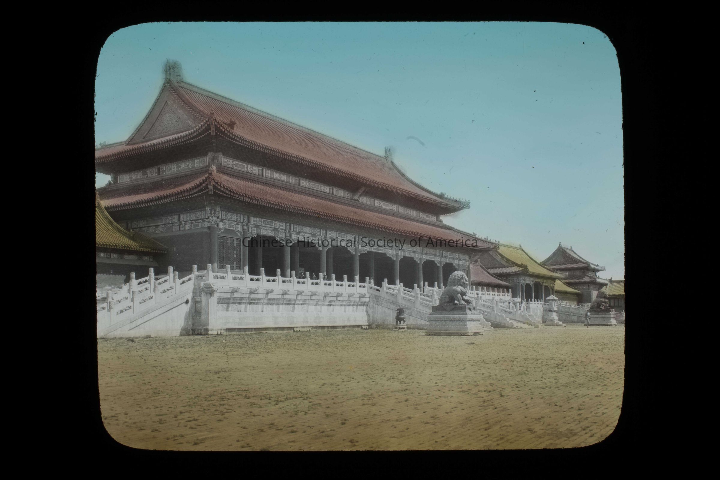 Text in the front: "Peking China", handwritten in white; "Pacific Railway", on a paper that was partly ripped away; "China. Peking. Forbidden City. Ho Tien. Former Imperial", typed in black on a paper glued to the slide.