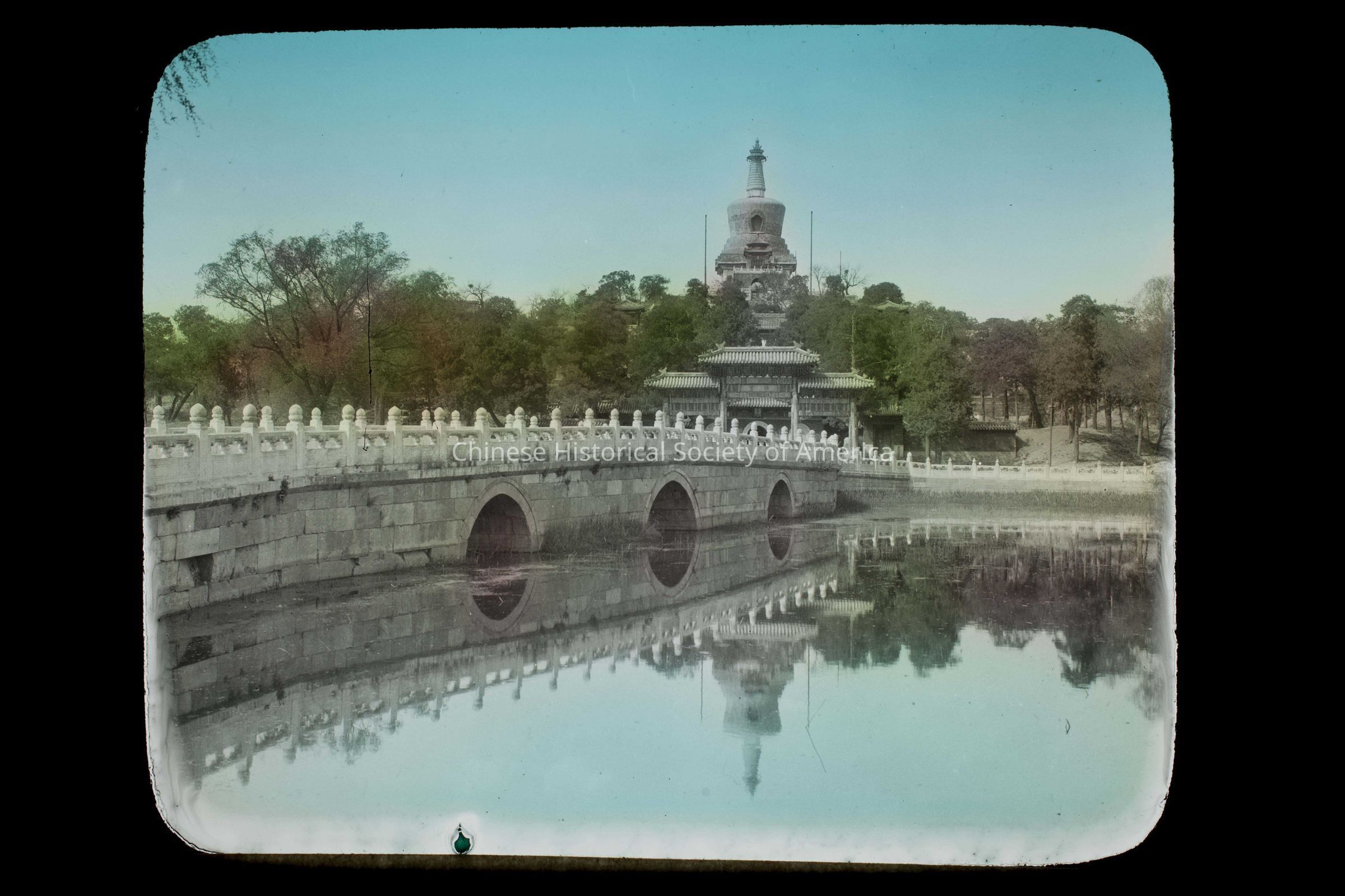 Text in the front: "China", handwritten in white; "Canadian Pacific Railway"; "China. Peking. Bottle Pagoda or Tibetan Dagoba, Winter Palace grounds.", typed in black on a paper glued to the slide.