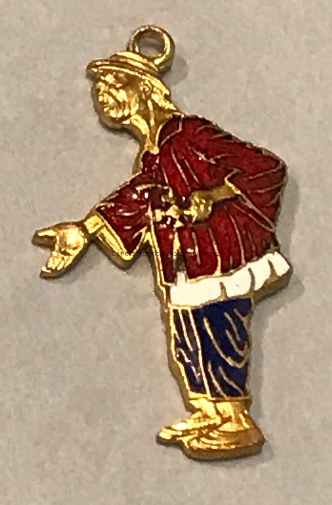 PIN- Figure of Chinese male holding an opium pipe in one hand and begging with the other. Gold skin, wearing a red top and blue bottoms. Back says, "Me Wantee Glauber Cockee Workee Easy Never Leakee Glauber Cleveland Ohio." Envelope beside it says, "Glauber Cockee Circa 1900 Bastian Brothers Rochester N.Y. DDMP 3/29/84."