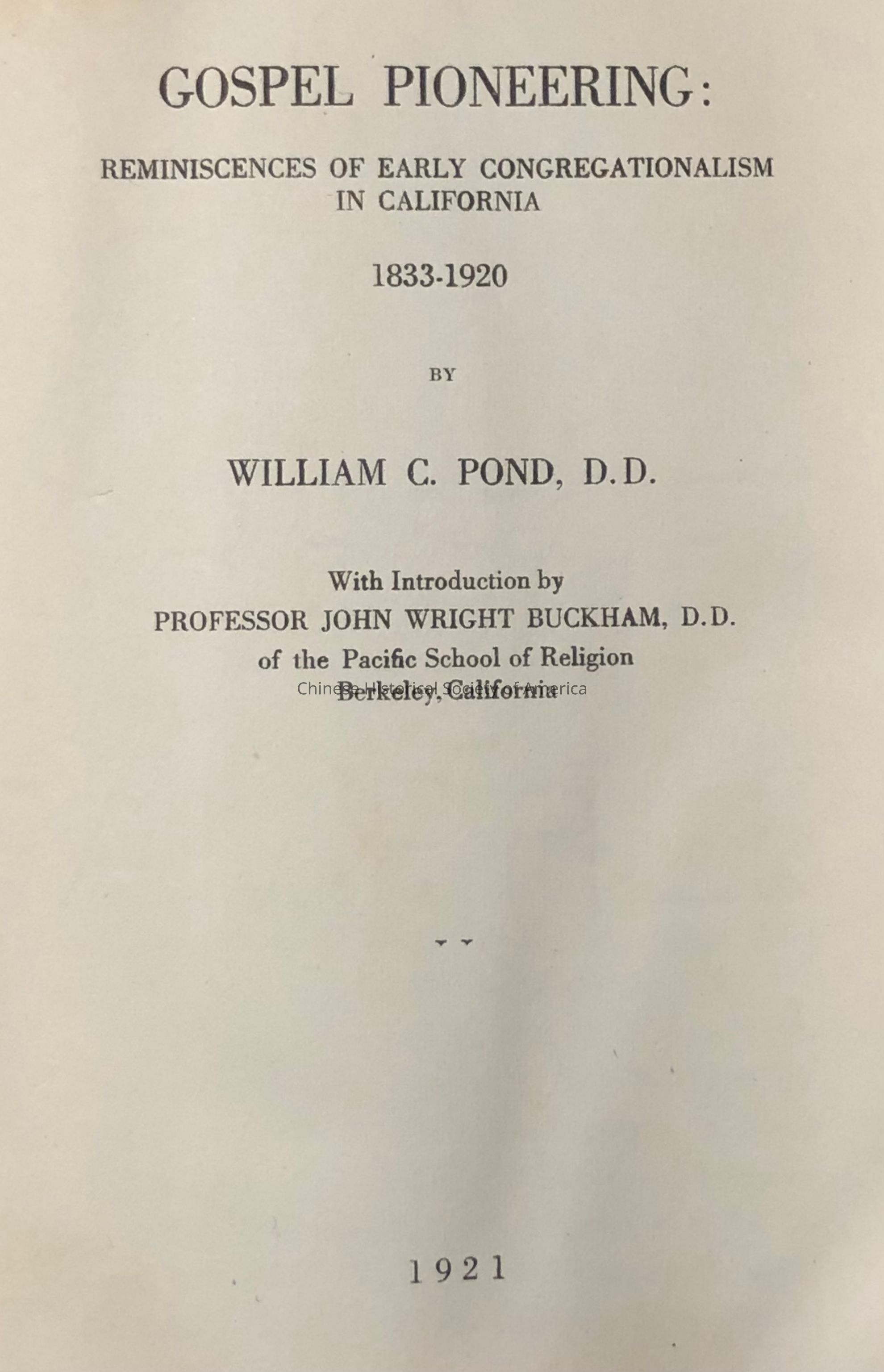 The son of a Maine Congregational leader, William Chauncey Pond (b. 1830) sailed around the Horn to California as a "home missionary" in 1853. Gospel pioneering (1921) presents highlights of his career in the West: creation of San Francisco's Greenwich St. Church; ministry in the Sierra County mining town of Downieville; story of The Pacific, a Congregationalist-Presbyterian journal; founding of the Pacific School of Religion; and Pond's ministry to Chinese immigrants, centered on San Francisco's Bethany Church, hardcover, 191 pagesDimensions
