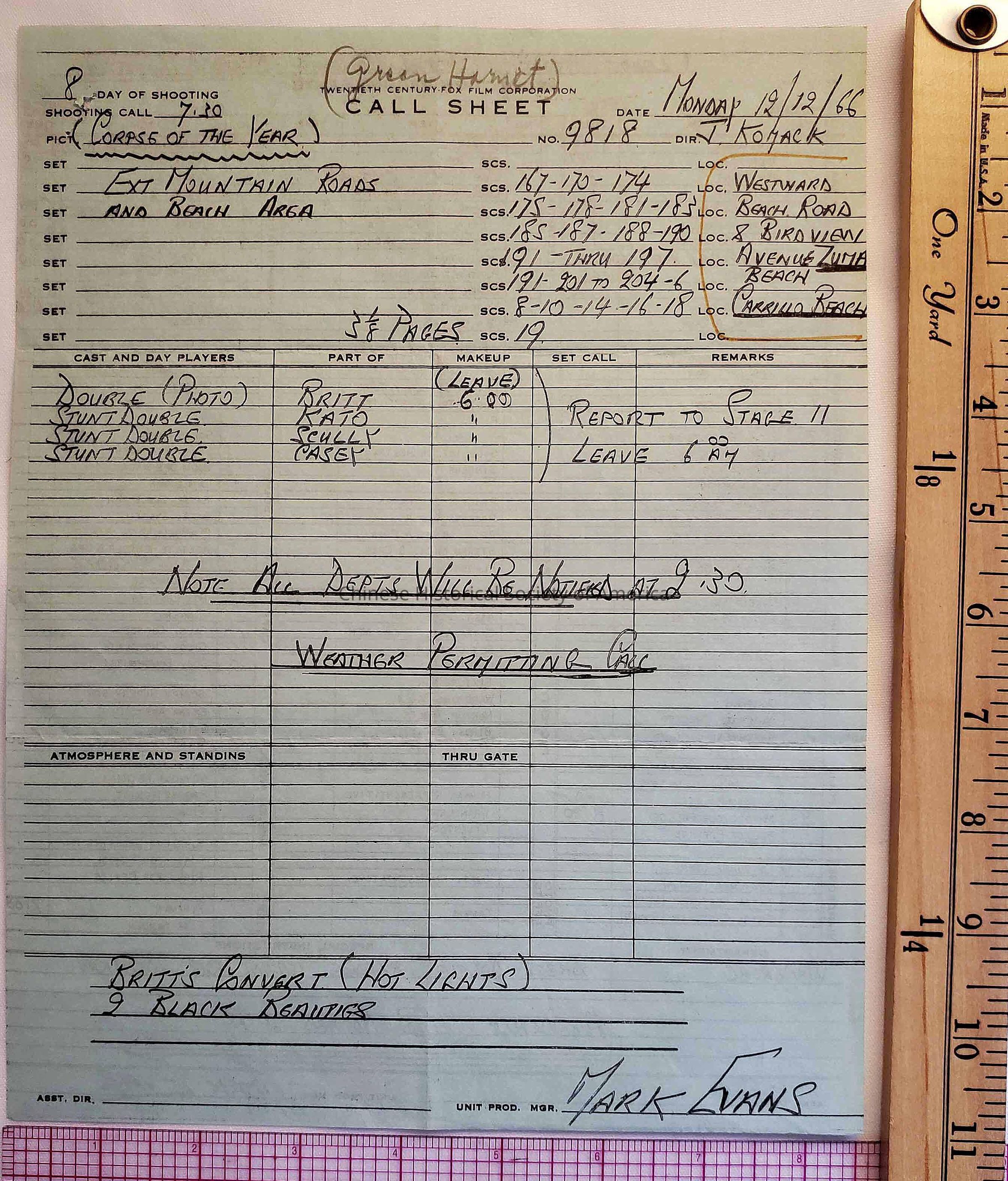Green Hornet Call Sheet on15th day of shooting, including director, set location, cast, set call, etc.Dimensions