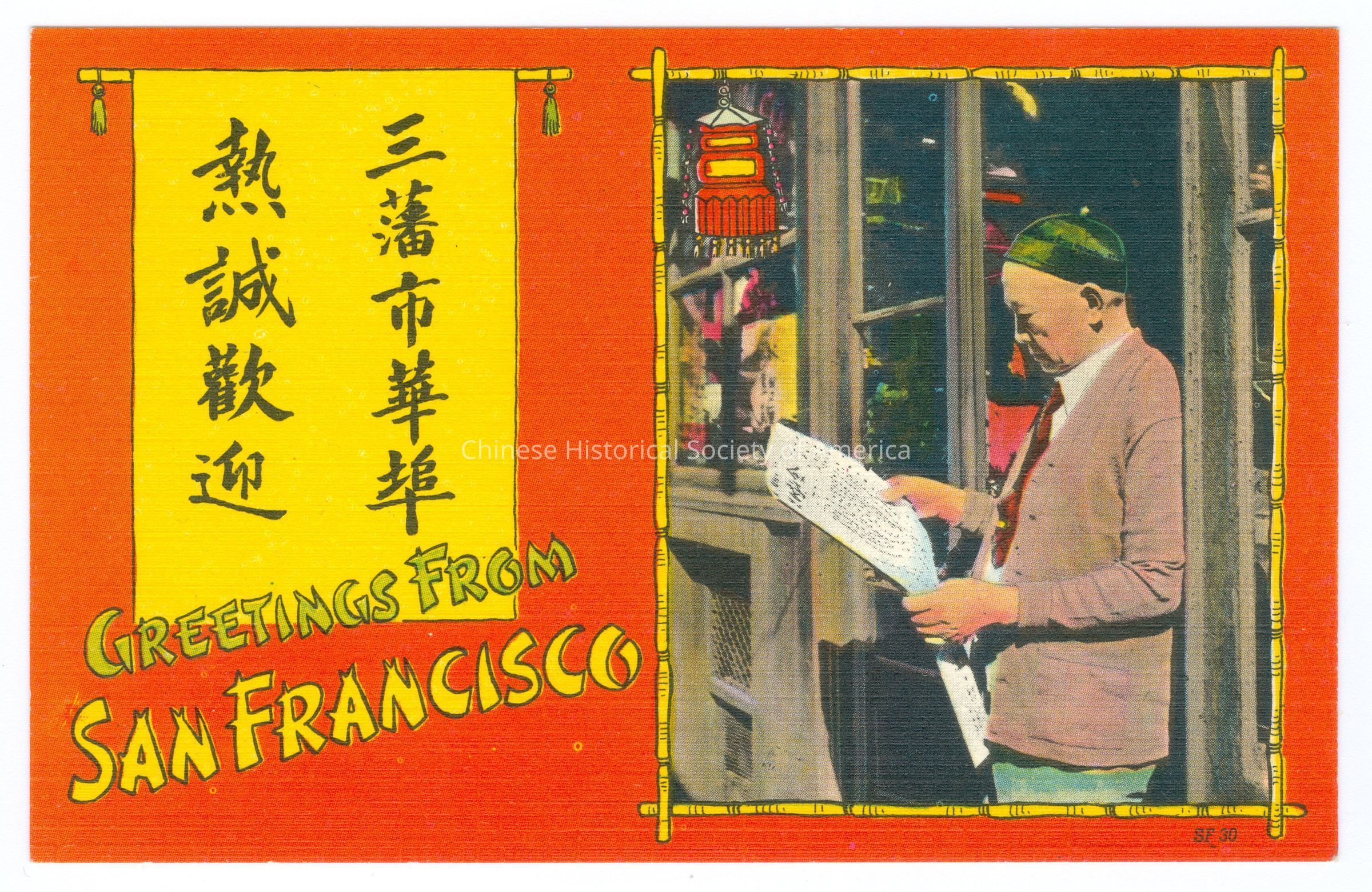 Front: Caption: "Greetings From San Francisco." "SF 30." Back: Info. Text: "Greetings From San Francisco, K8773, San Francisco is located on a hilly peninsula between the Pacific and San Francisco Bay which are connected by the strait of the Golden Gate. It has one of the largest land-locked harbors in the world and is one of the world's most fabled and glittering cities." "Pub. by Smith News Co., 219-7th Street, San Francisco, Calif." K8773