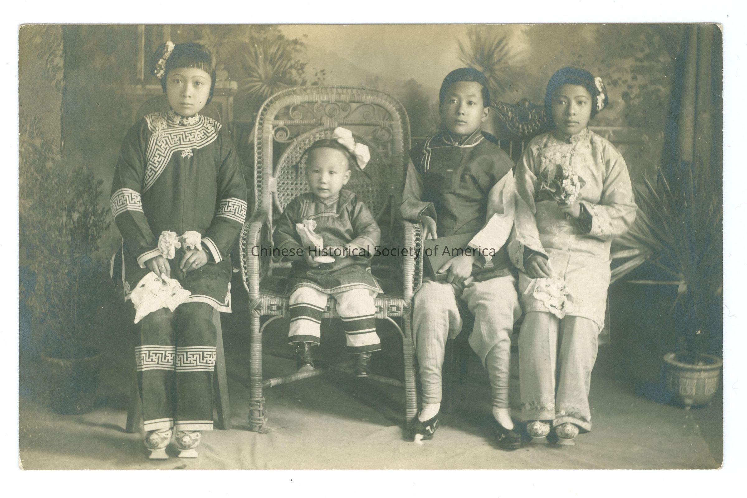 B&W. Photo. SF; Singing Children: There are 4 Chinese children sitting down, there are 2 girls holding flowers in their hands one in black the other white flanking the other 2 children which is one boy and one little girl sitting in a large straw chair.