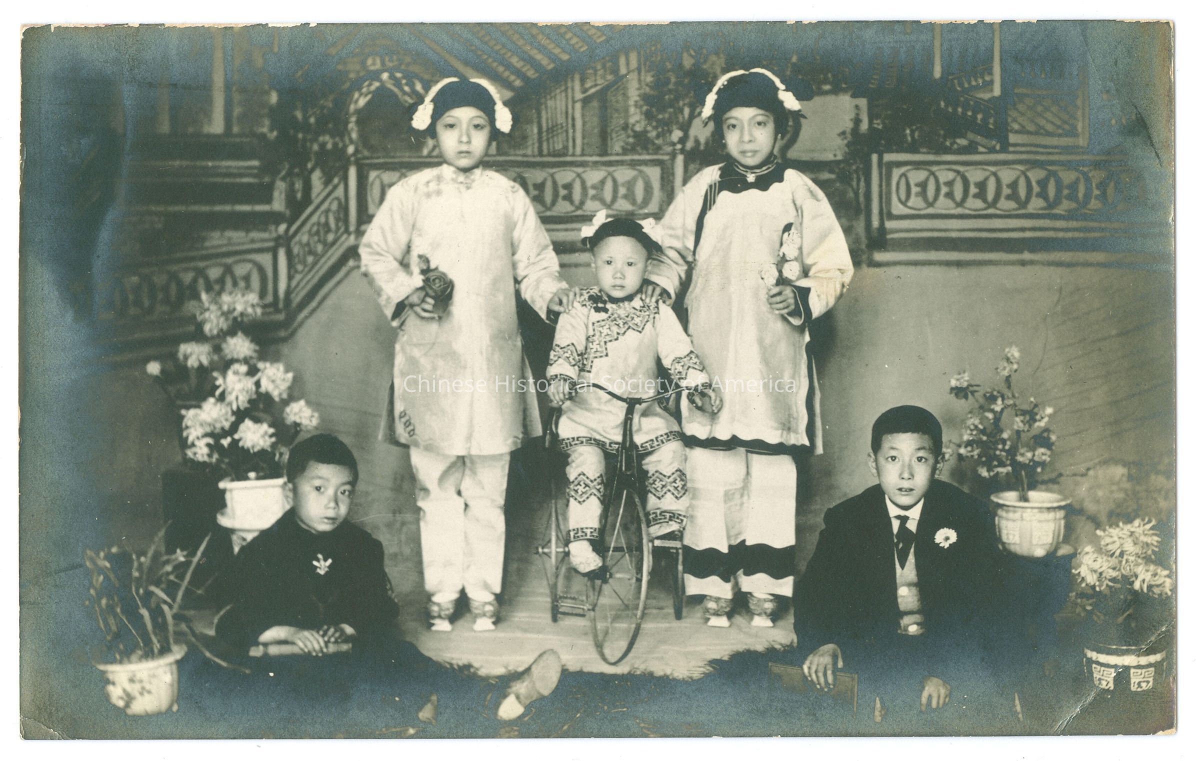 B&W. Photo. SF; Singing Children: 5 Chinese children, there are 2 girls holding flowers in one hand and the other is on the shoulder of the little girl between them who is on a bike and there are 2 boys in black sitting at their feet.