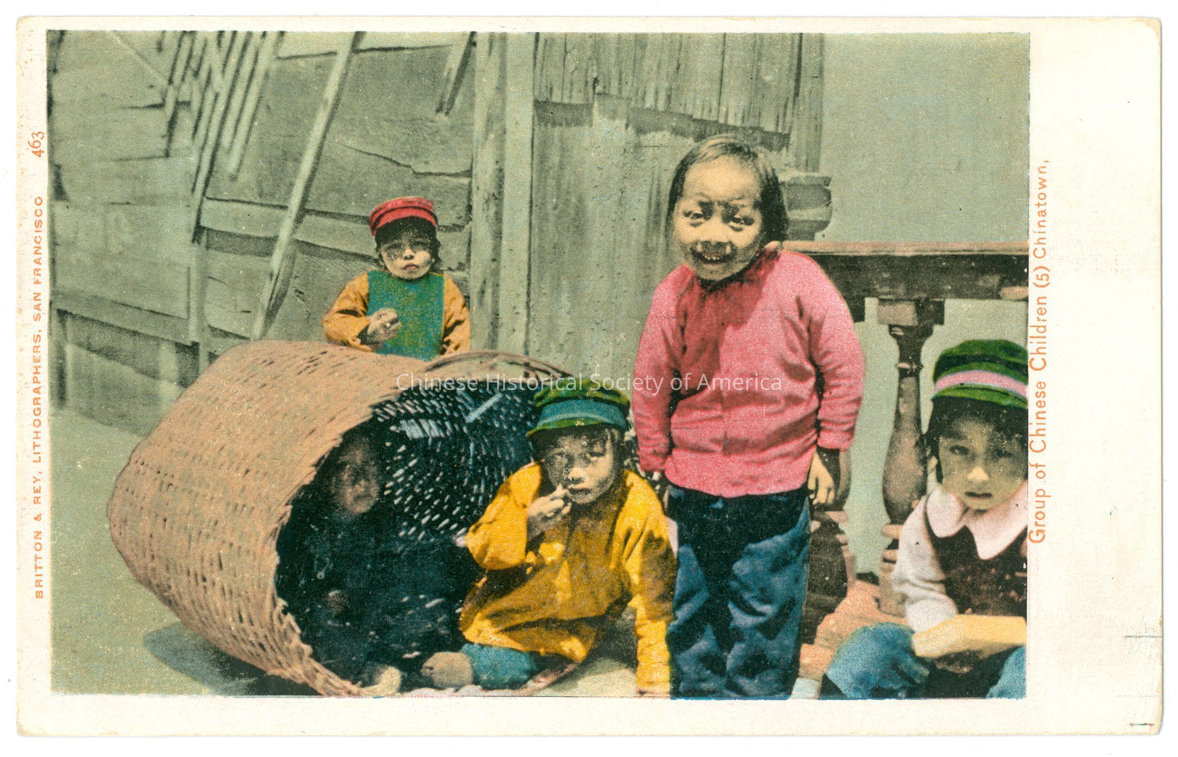 Front: Caption: "Group of Chinese (5) Chinatown." "Britton & Rey, Lithographers, San Francisco 463." Back: "1.50", handwritten in pencil on the bottom right hand corner. Old Accession #: DEXDimensions