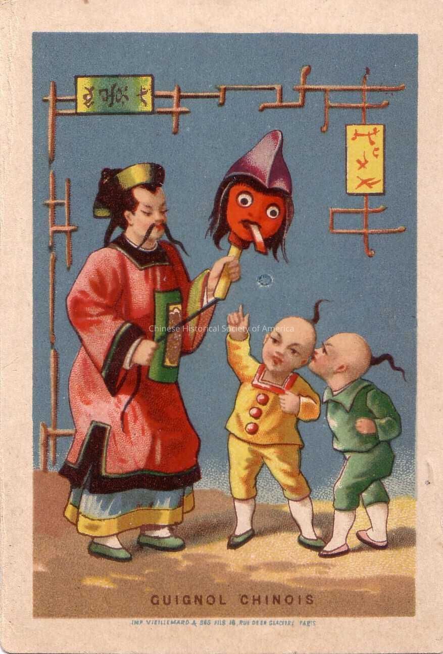 Front: A man with a red, green, yellow, and black robe and a queue is holding a red mask with a string attached to it and showing the product to two little boys. The boys; one wearing yellow and the other in green are entralled with the mask. The words "Guignol Chinois" can be found at the bottom of the picture along with the following footnote: "Imp Vieillemard & Ses, Ig, Rue De Sesa Glaciere Paris"