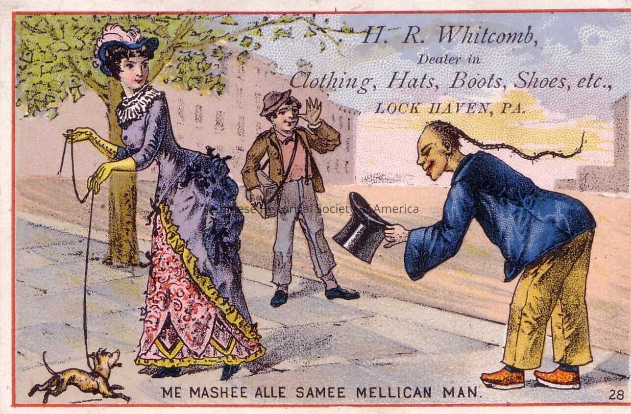 Front: On the left side of the tradecard is a Caucasian woman wearing a Victorian era gown and walking her dog. She is looking at the Chinese man who is holding his hat as he bows at her. Another man off to the side, a messenger boy, is looking at the Chinese man and ridiculing him by making faces at him. At the center of the bottom border is the following notation: "Me Mashee Alle Samee Melican Man" and the ad for this tradecard is for: H.R. WHITCOMB