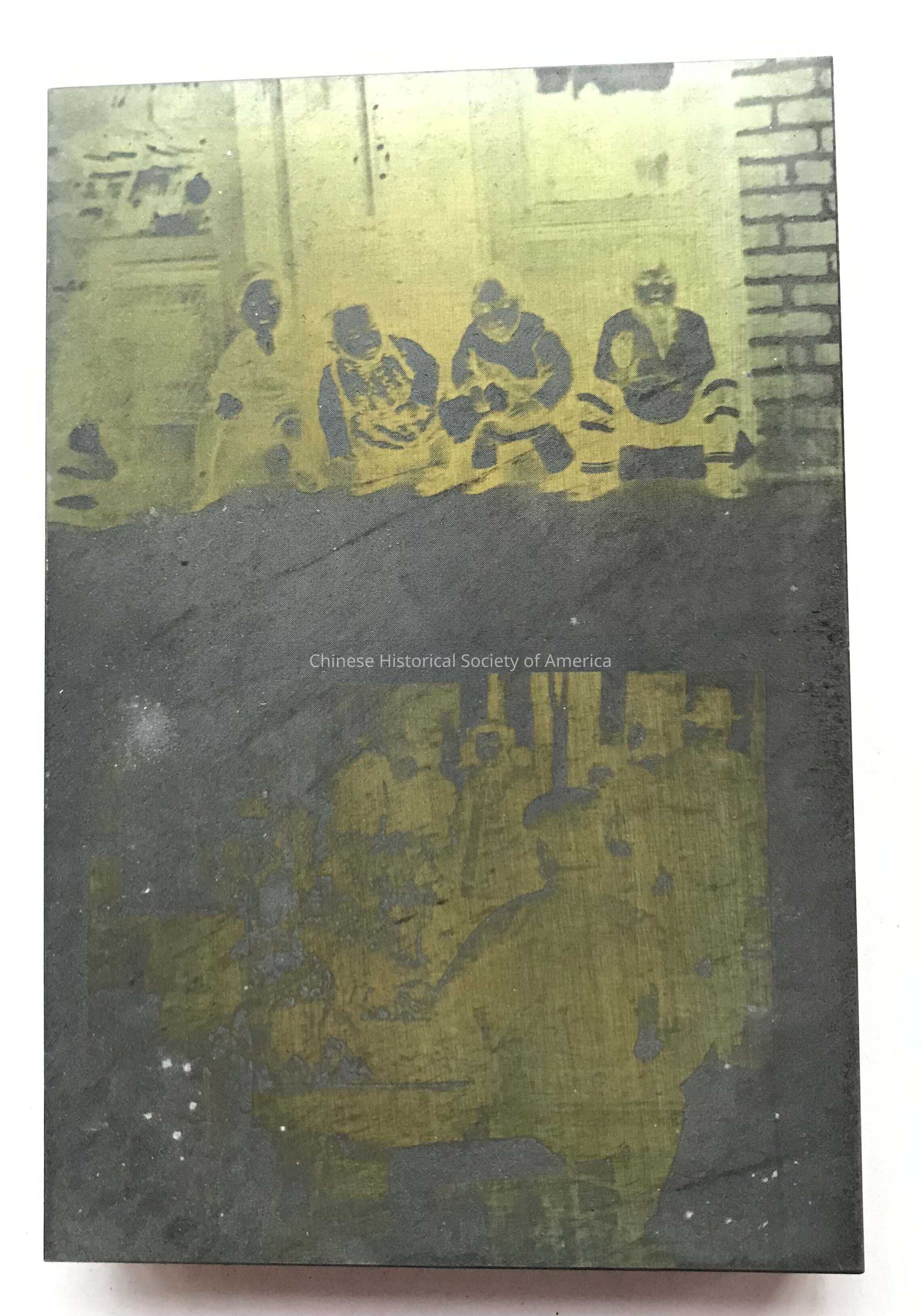 Printing block depicts children sitting on the street above and a group of people below.