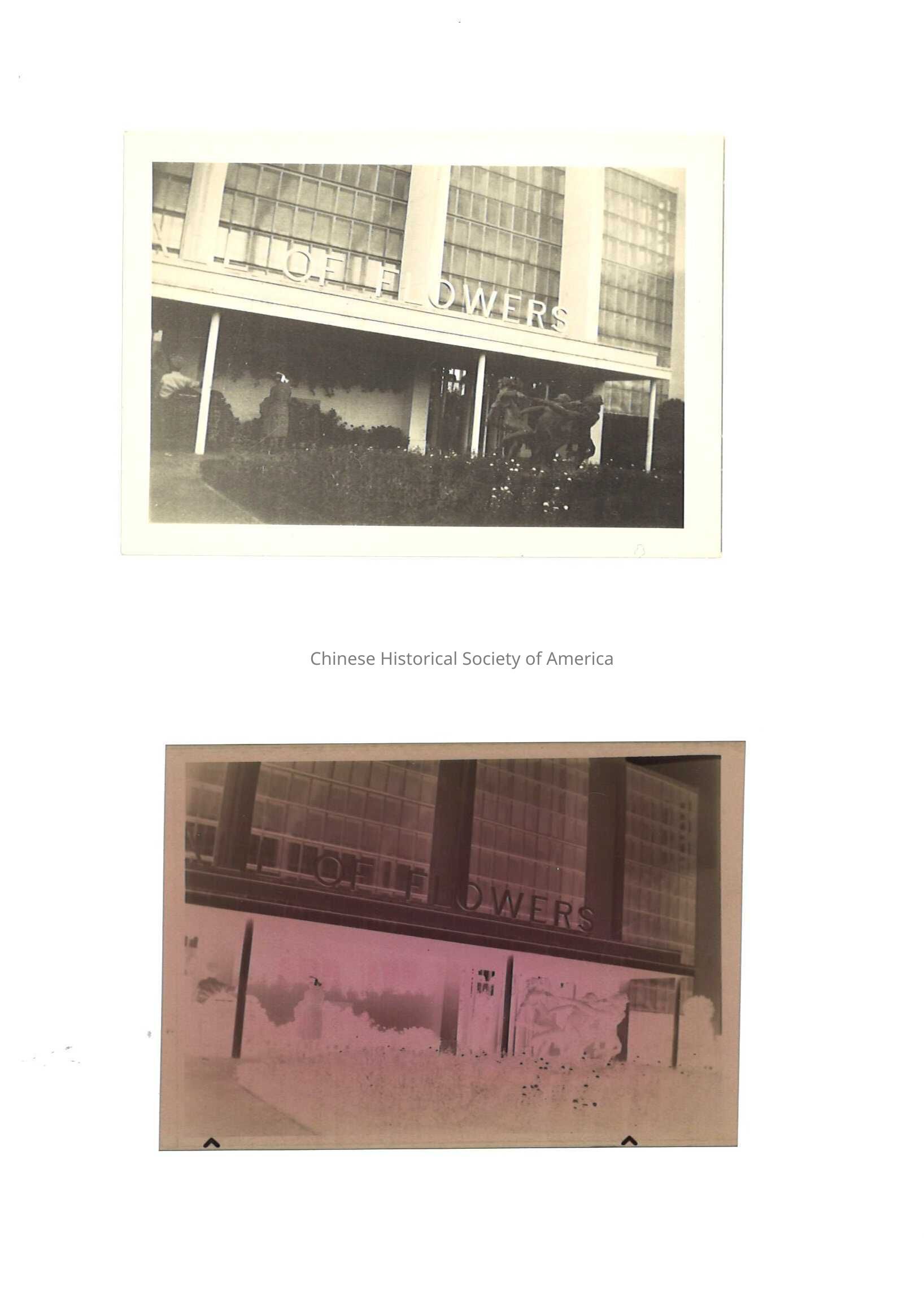 A: Hall of Flowers building and its cubular pixie glass windows. A statue and patch of grass and flowers is in front of the building. B: photo negative
