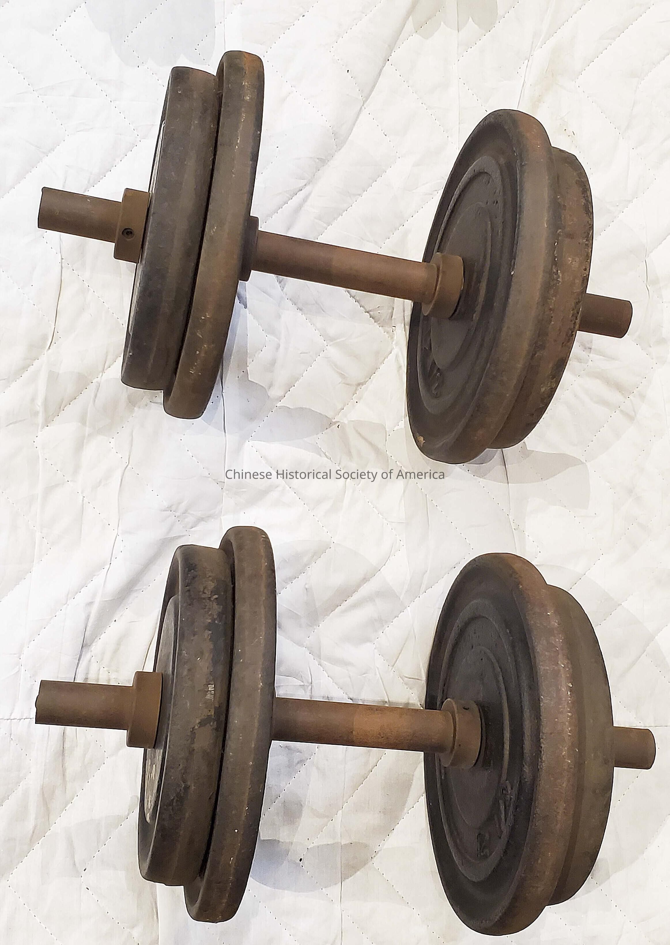 Hand barbell set 50 Lbs each, made by James Lee for Allen Joe, a Northern California Bodybuilder, lightweight division champion, 1946.Context