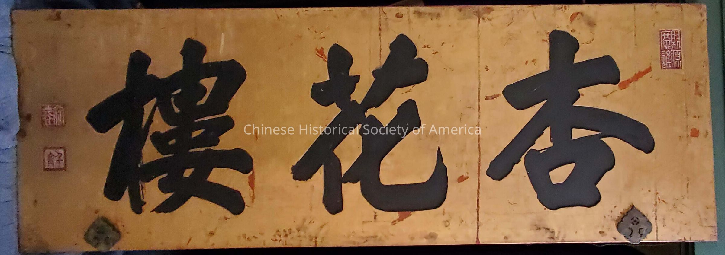Horizontal reading wood sign with 3 large engraved characters (杏花樓) Hang Far Low Restaurant, 4 chop stamps and two decorative spade shaped attachments, characters in black, gold and red fieldDimensions