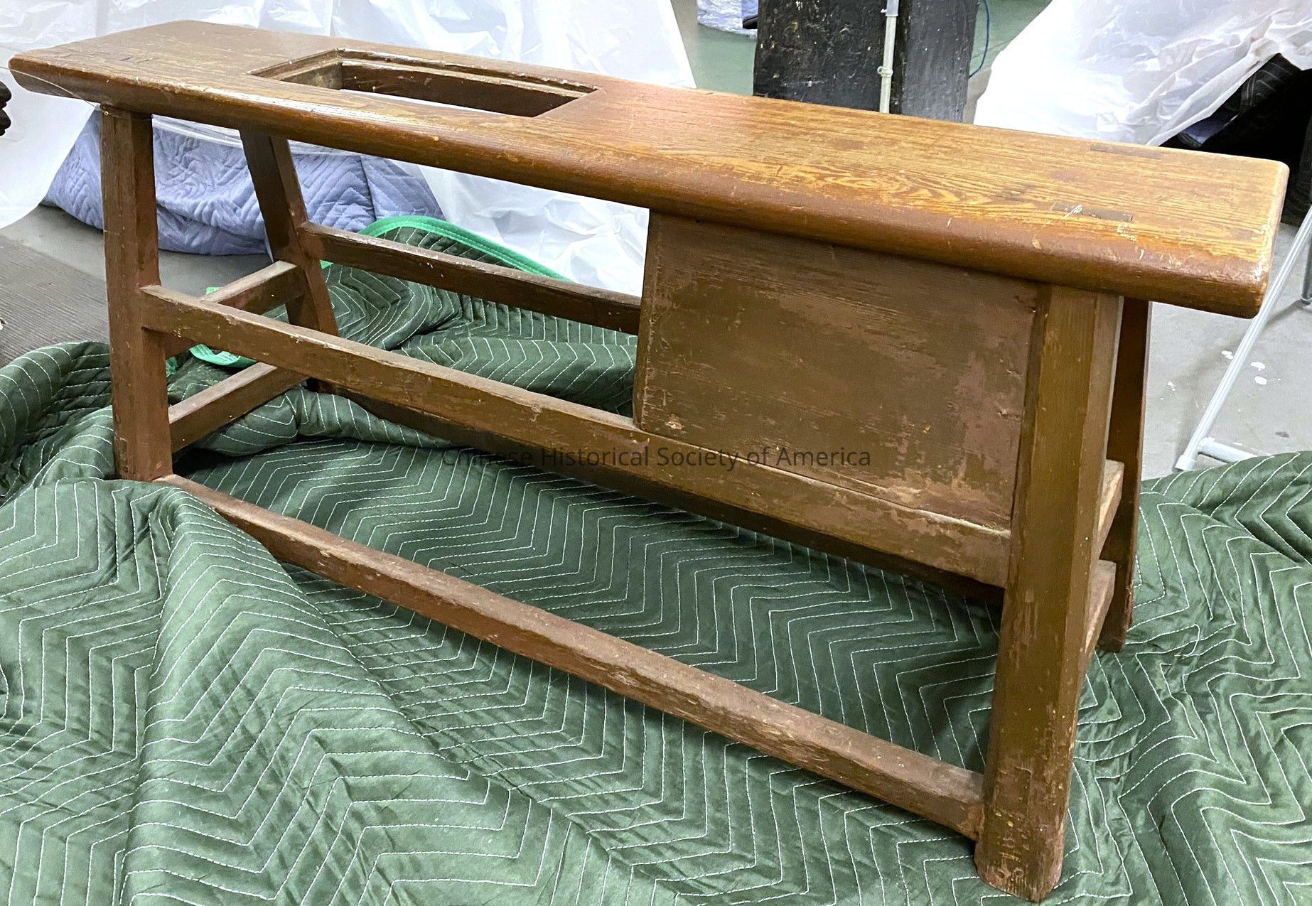 Label 3: Wooden workbench used in Chinese herb shop